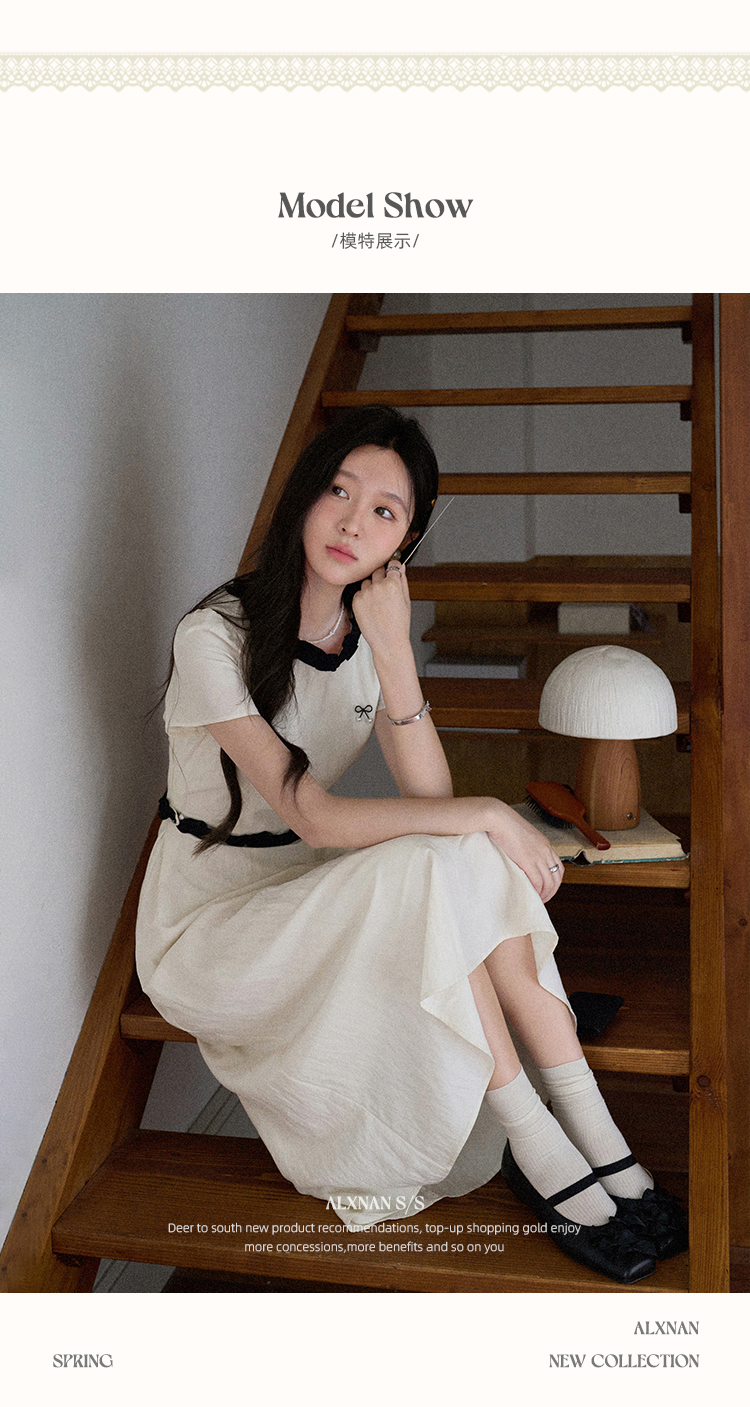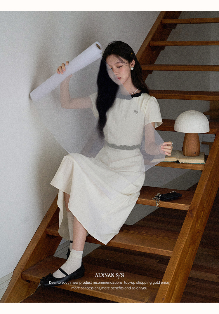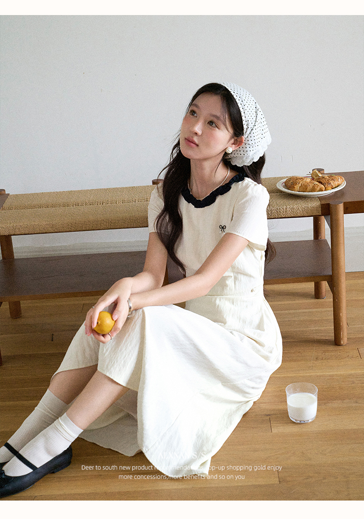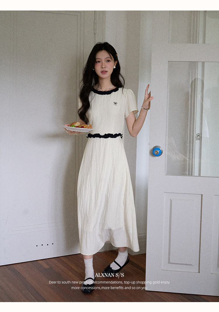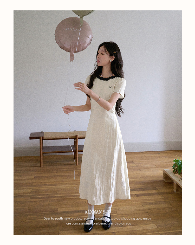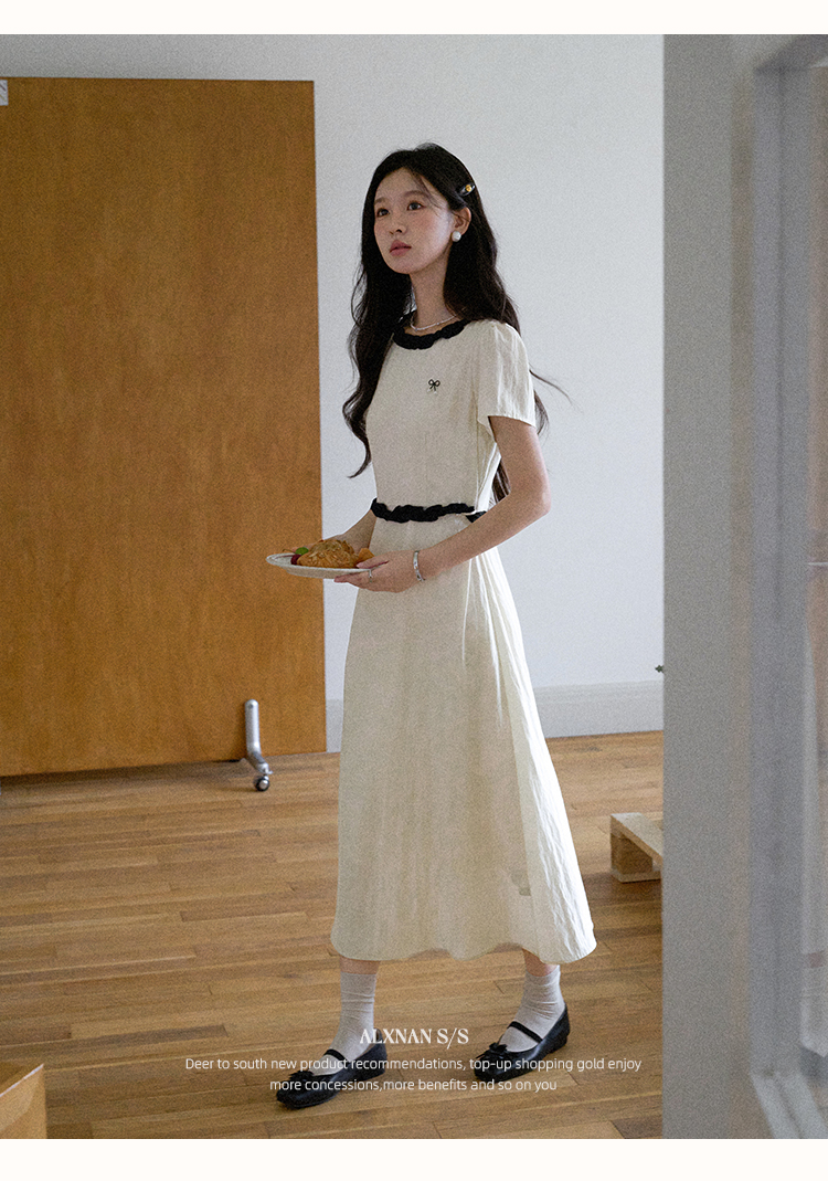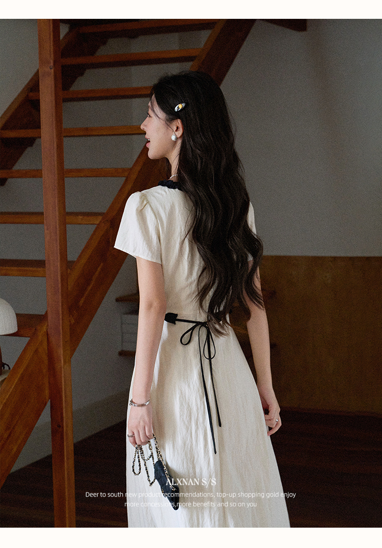 鹿向南「椰青冷萃」法式米白色短袖连衣裙女夏收腰显瘦气质长裙子
