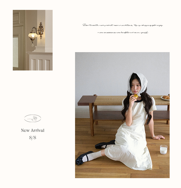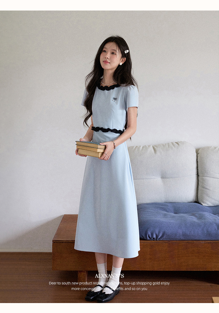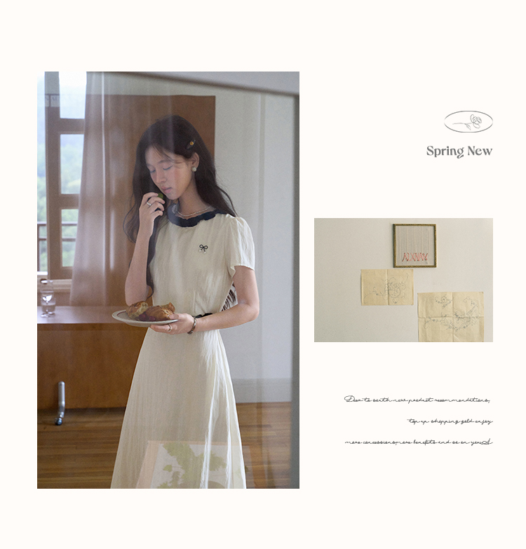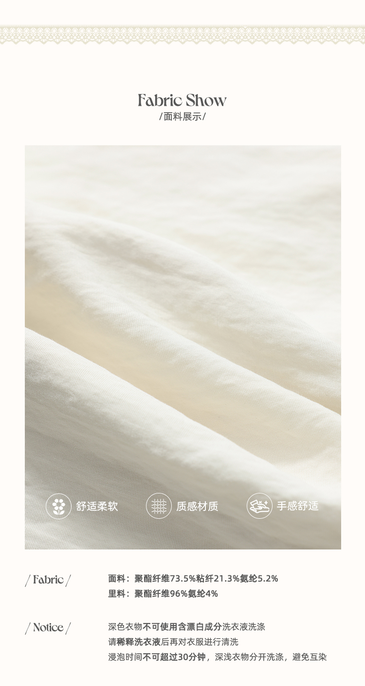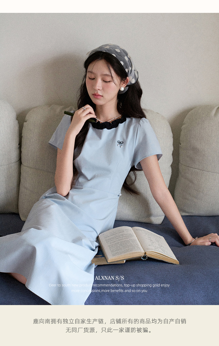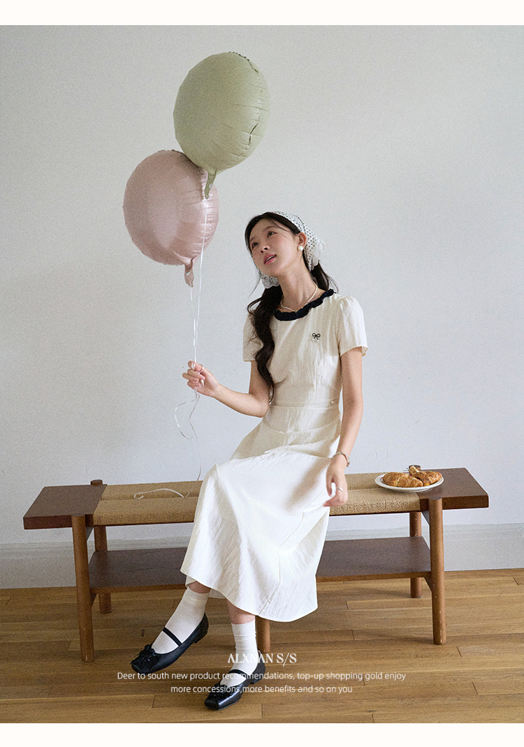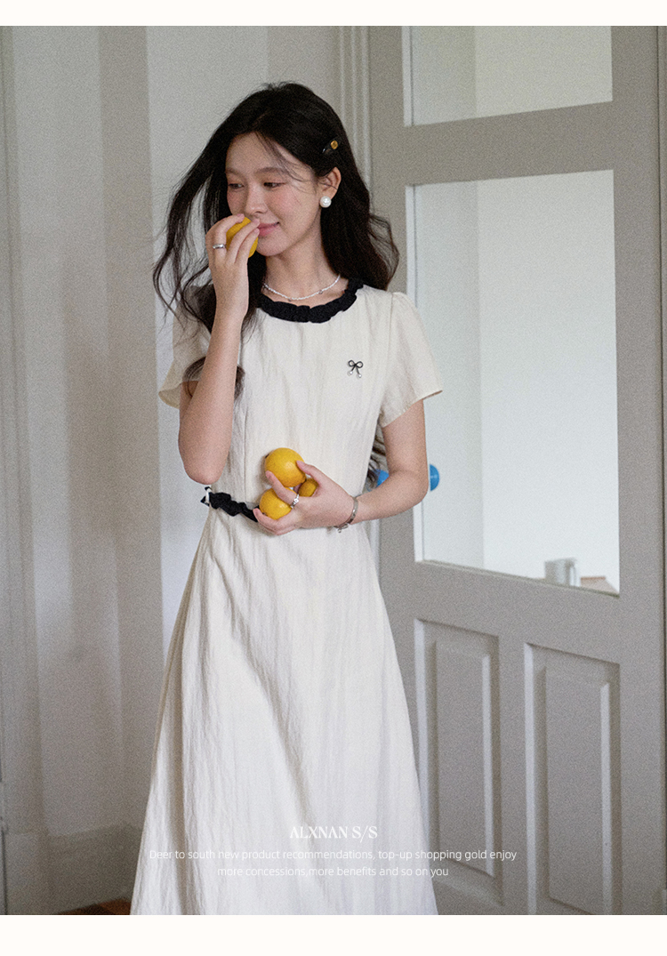 鹿向南「椰青冷萃」法式米白色短袖连衣裙女夏收腰显瘦气质长裙子