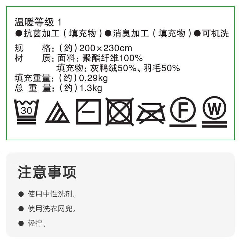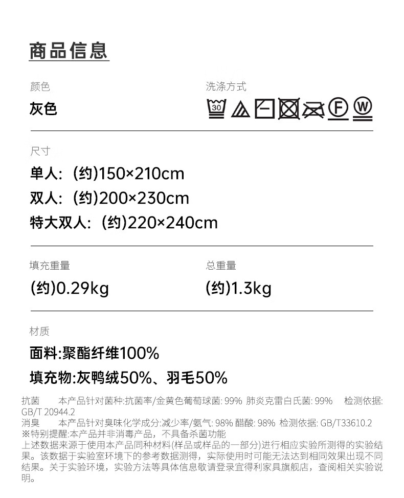 可水洗羽绒薄被 灰色 单人/双人/特大双人