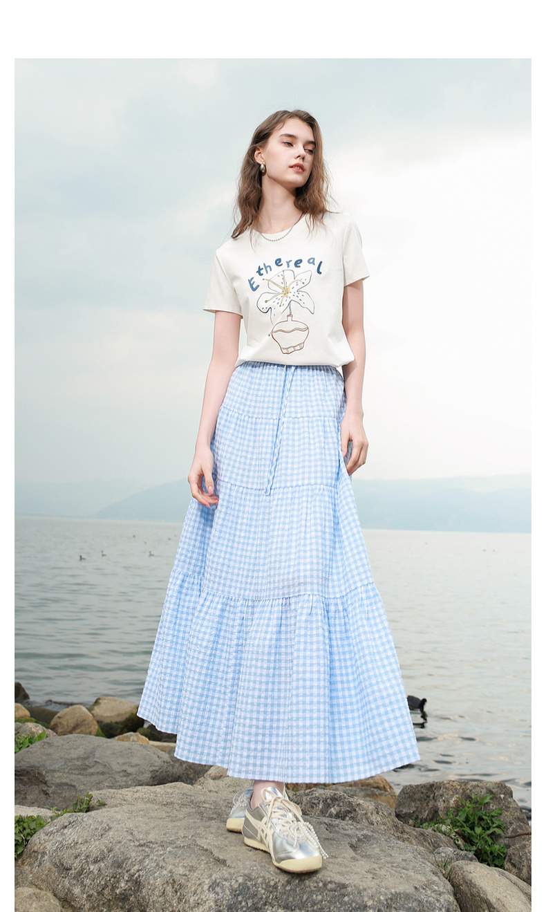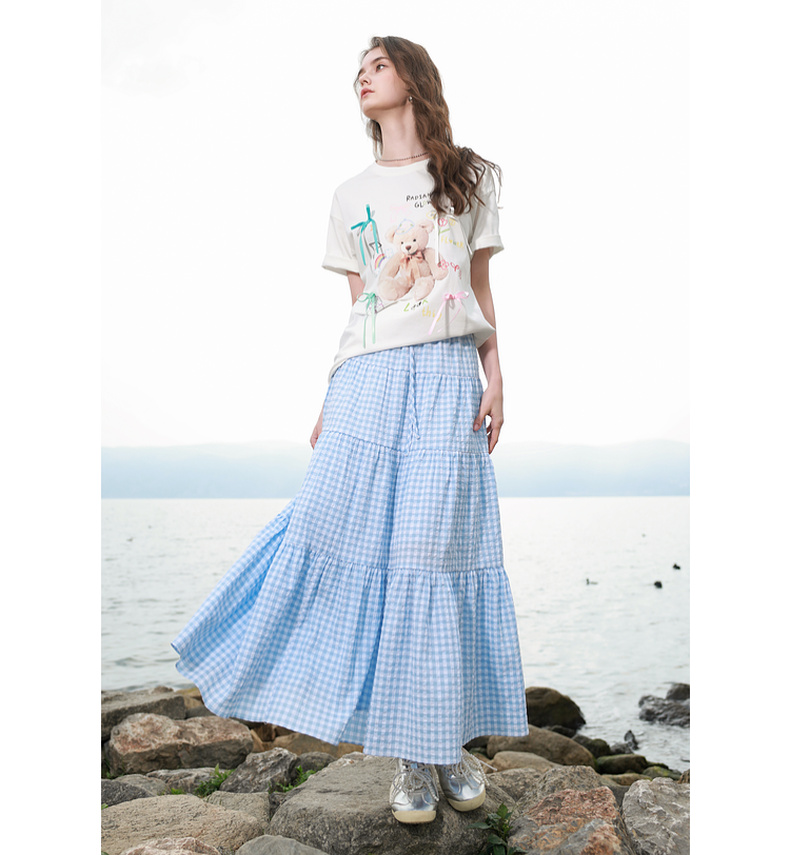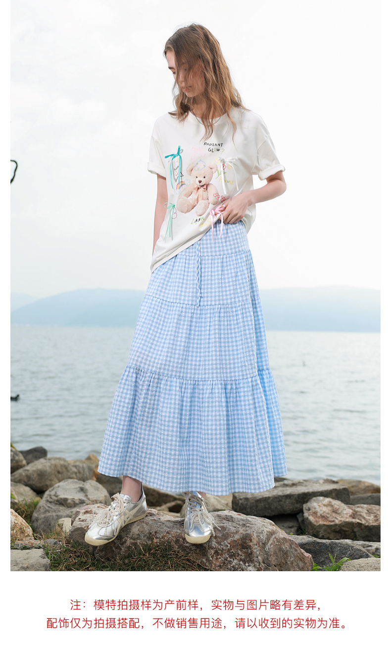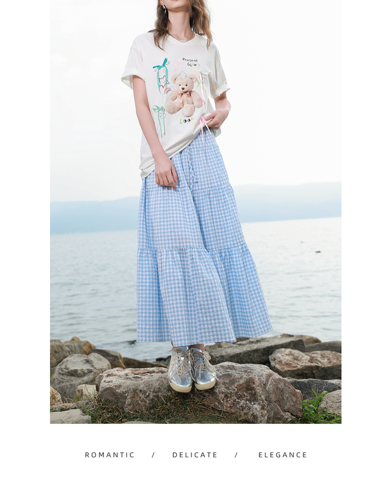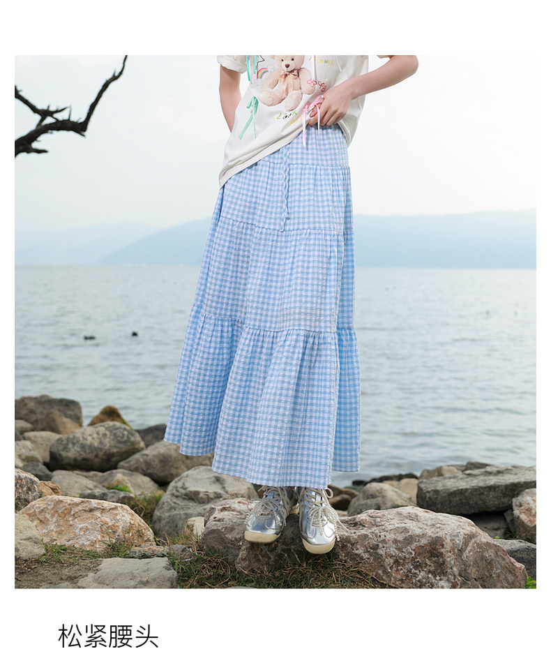 三彩2025夏季新款格纹半身裙肌理感松紧腰A字裙蛋糕长裙M