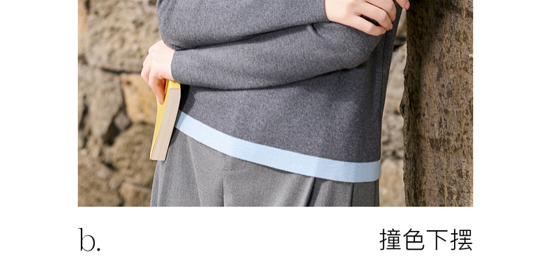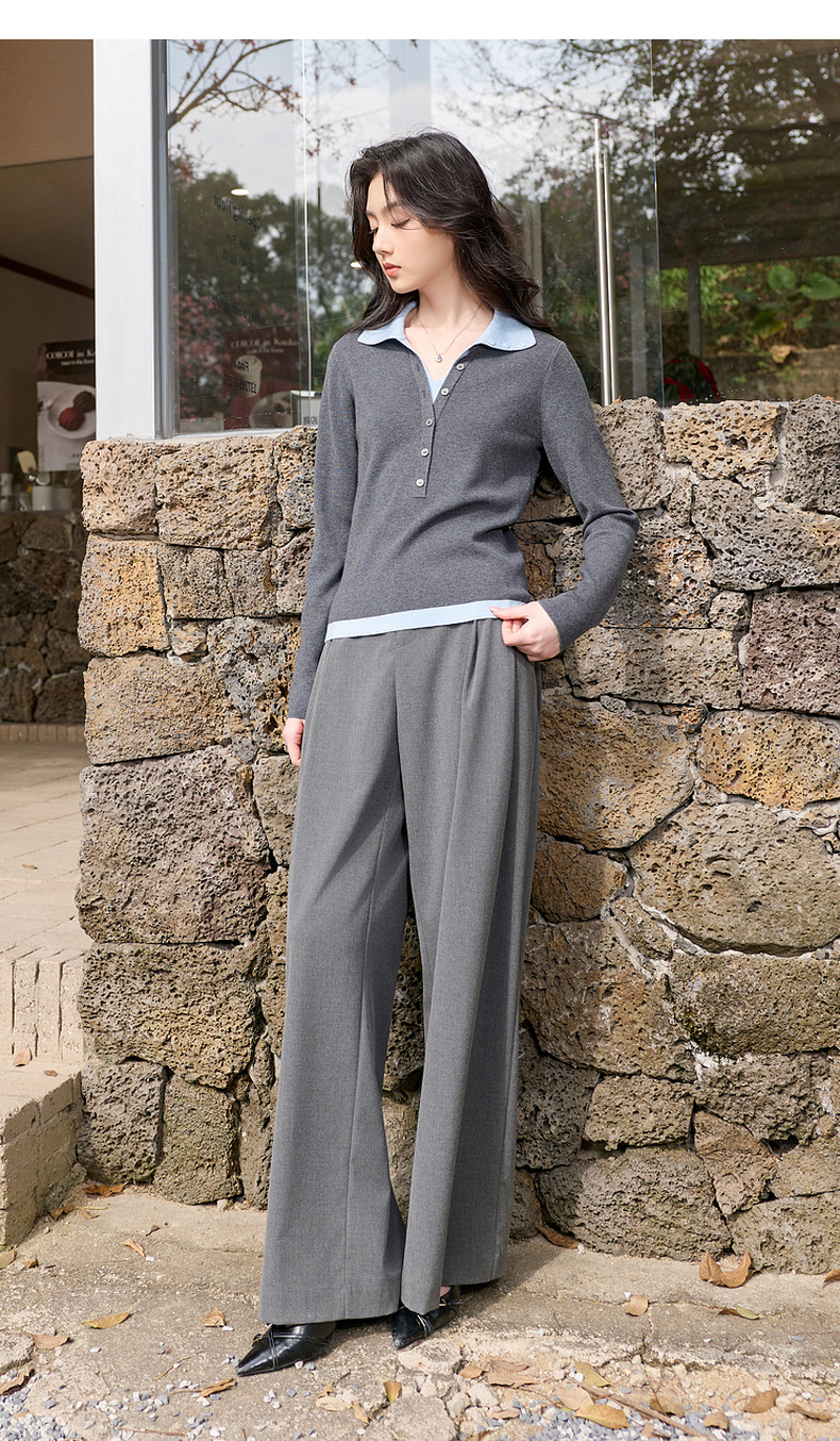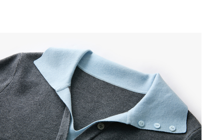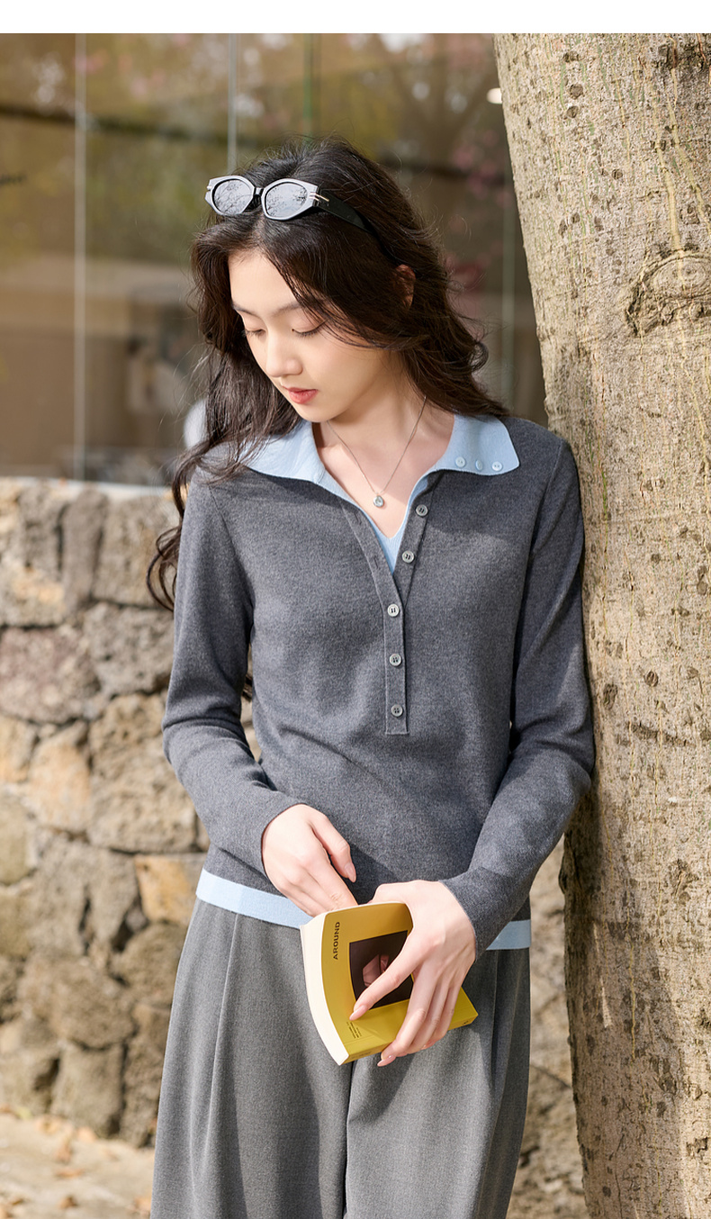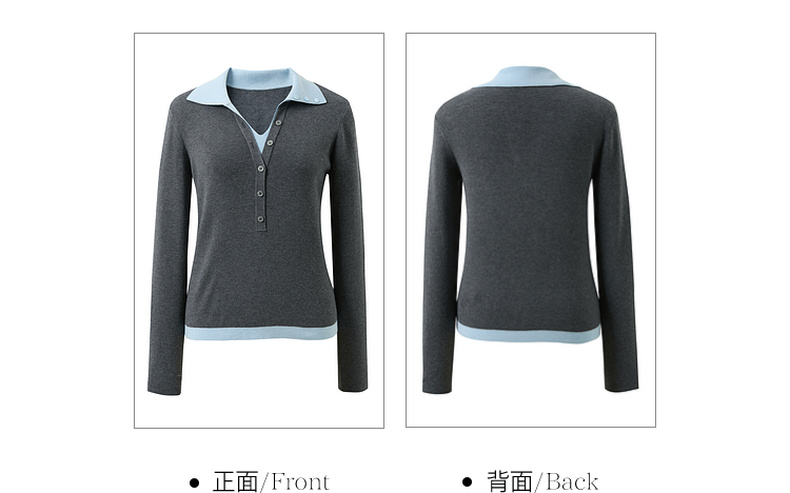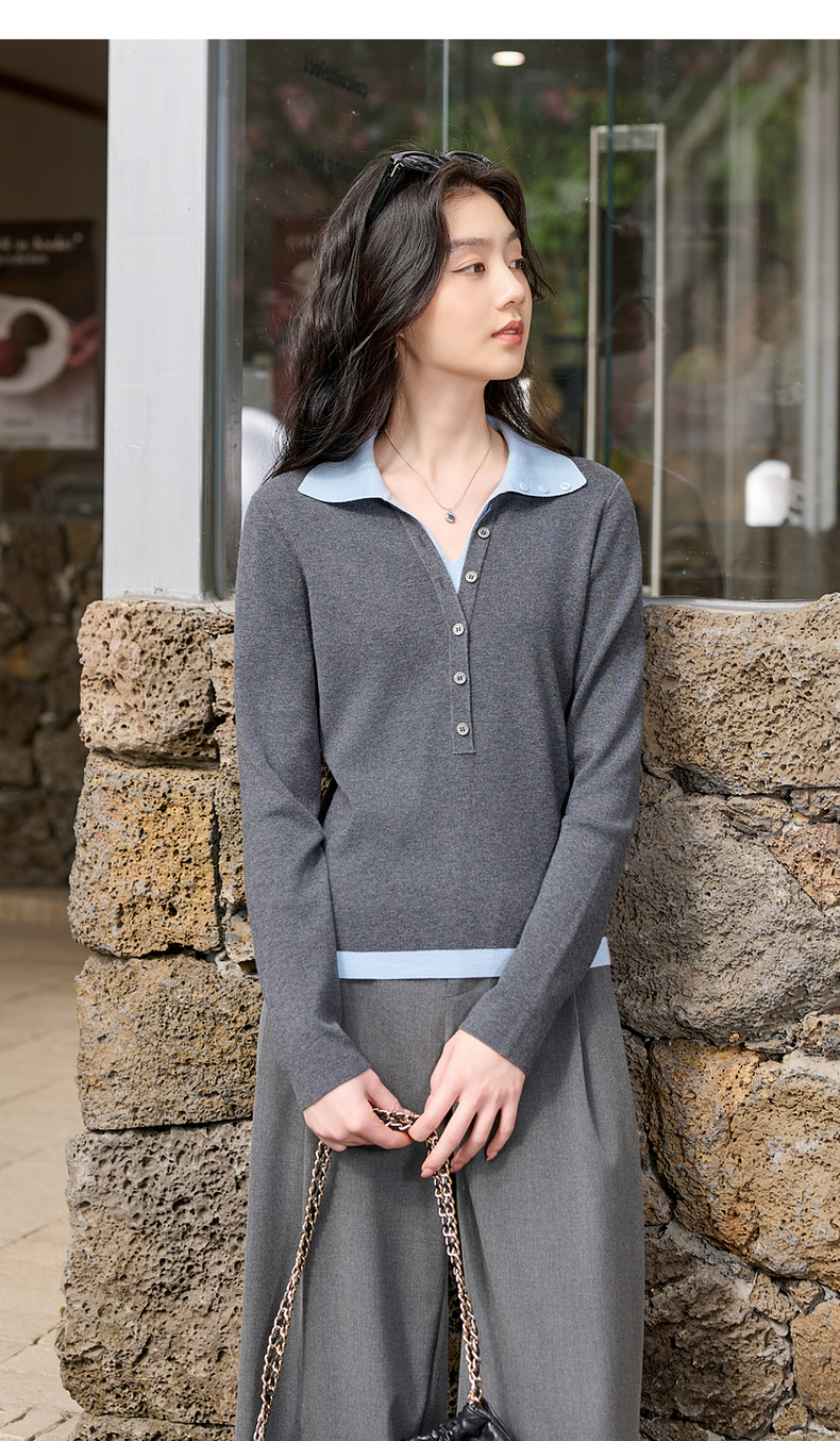 三彩2026春季新款假两件撞色Polo领长袖针织衫上衣套头衫修身S