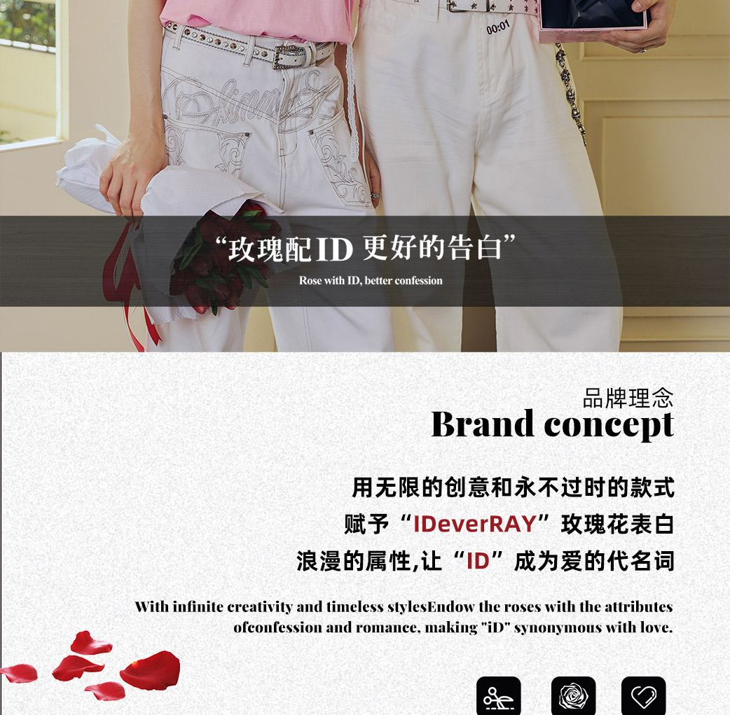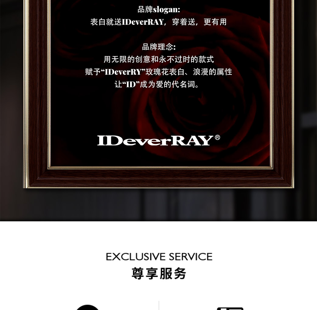 - ❣IDeverRAY简称“ID”,象征独一无二的个人标识,同时与"爱的"谐音,代表爱情的个性化表达 品牌slogan:玫瑰🌹配ID,更好的告白 品牌语言:I ID YOU