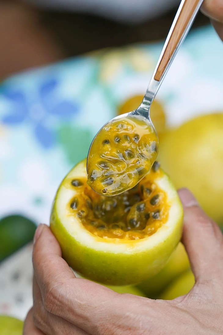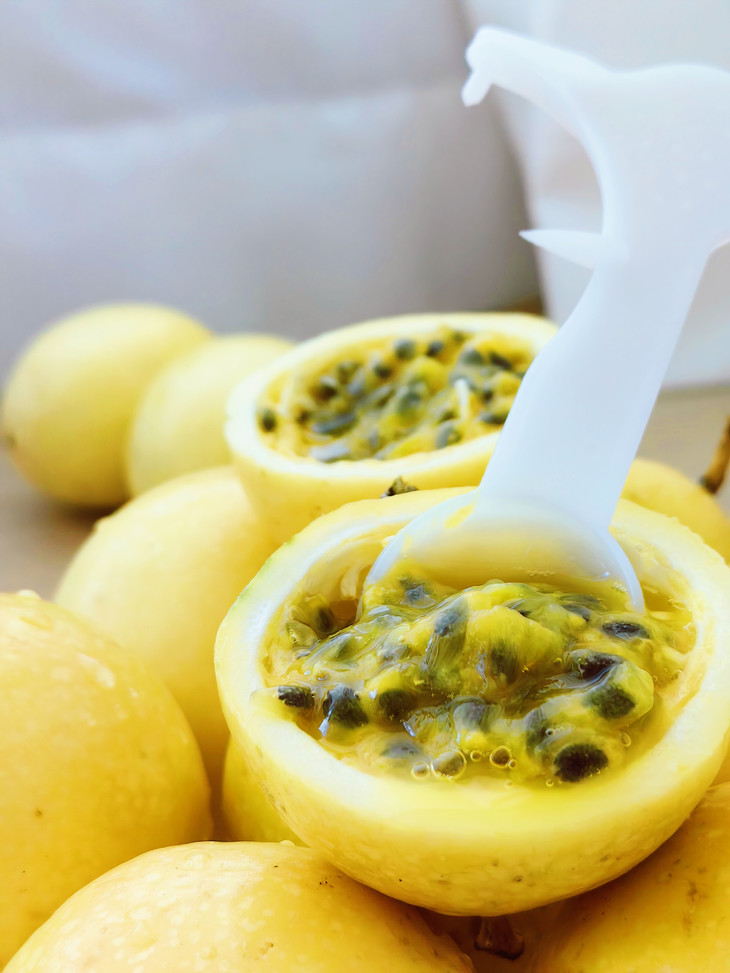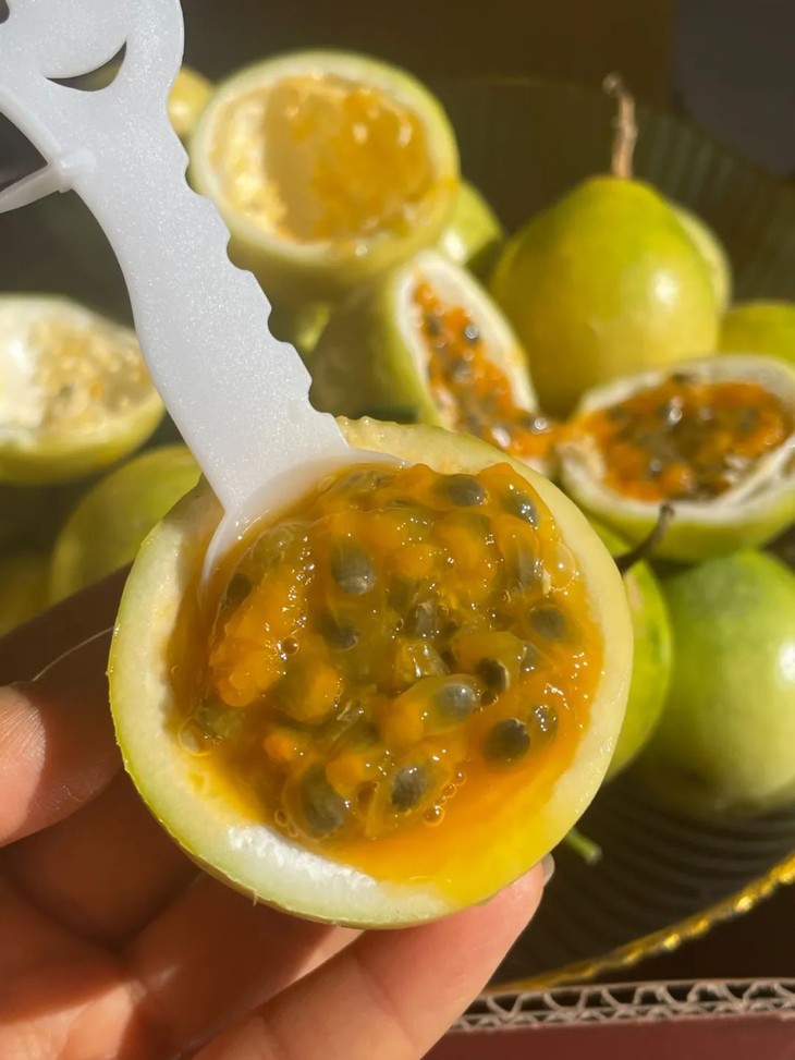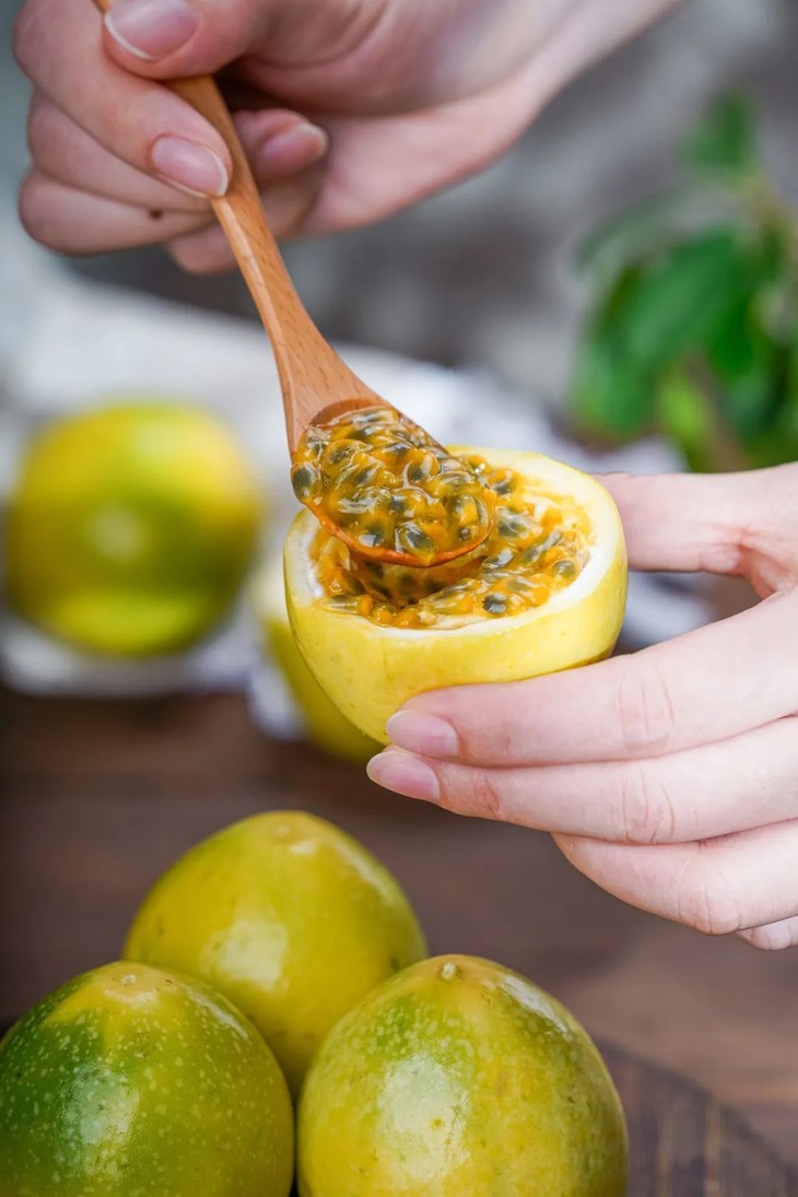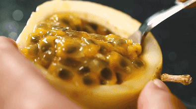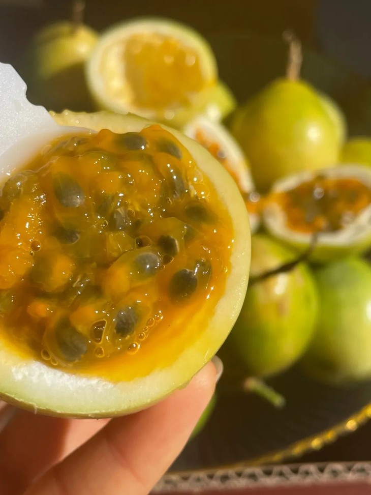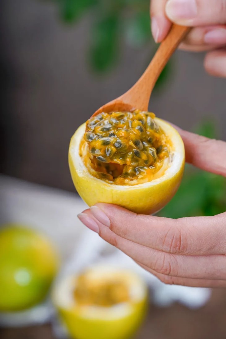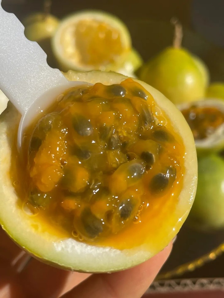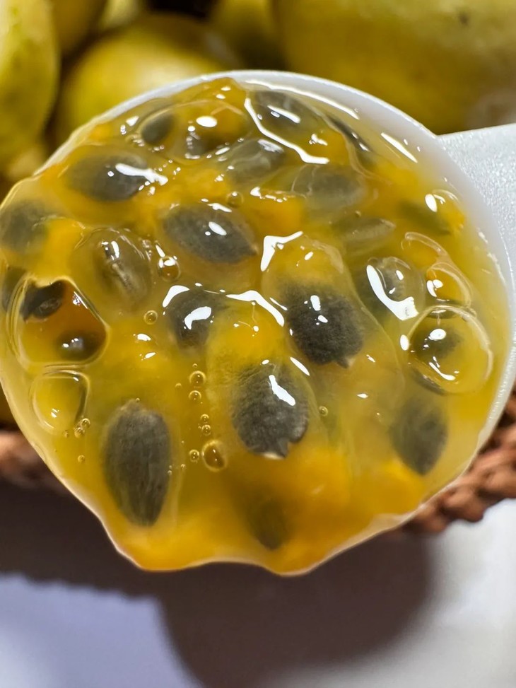 ❷ 果肉Q弹!嚼着吃的「果冻布丁」 金灿灿的果囊裹着晶莹汁水,咬破果籽的瞬间 —— 💦 爆浆感MAX:45%出汁率,汁水多到飙出来! 🍡 果冻般嫩滑:嚼着脆嫩果籽,像在吃百香果味QQ糖!