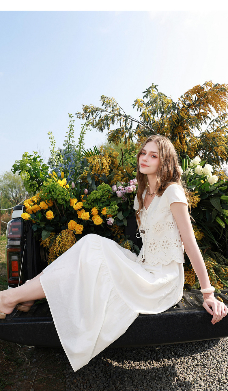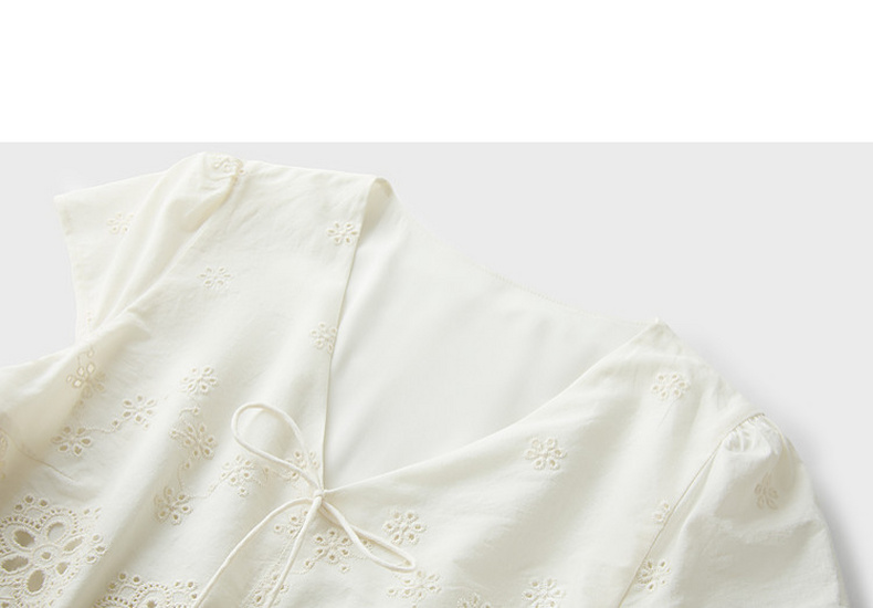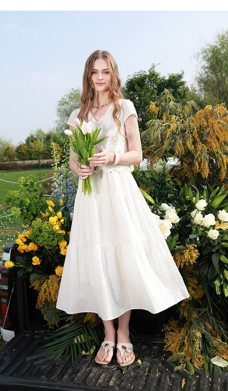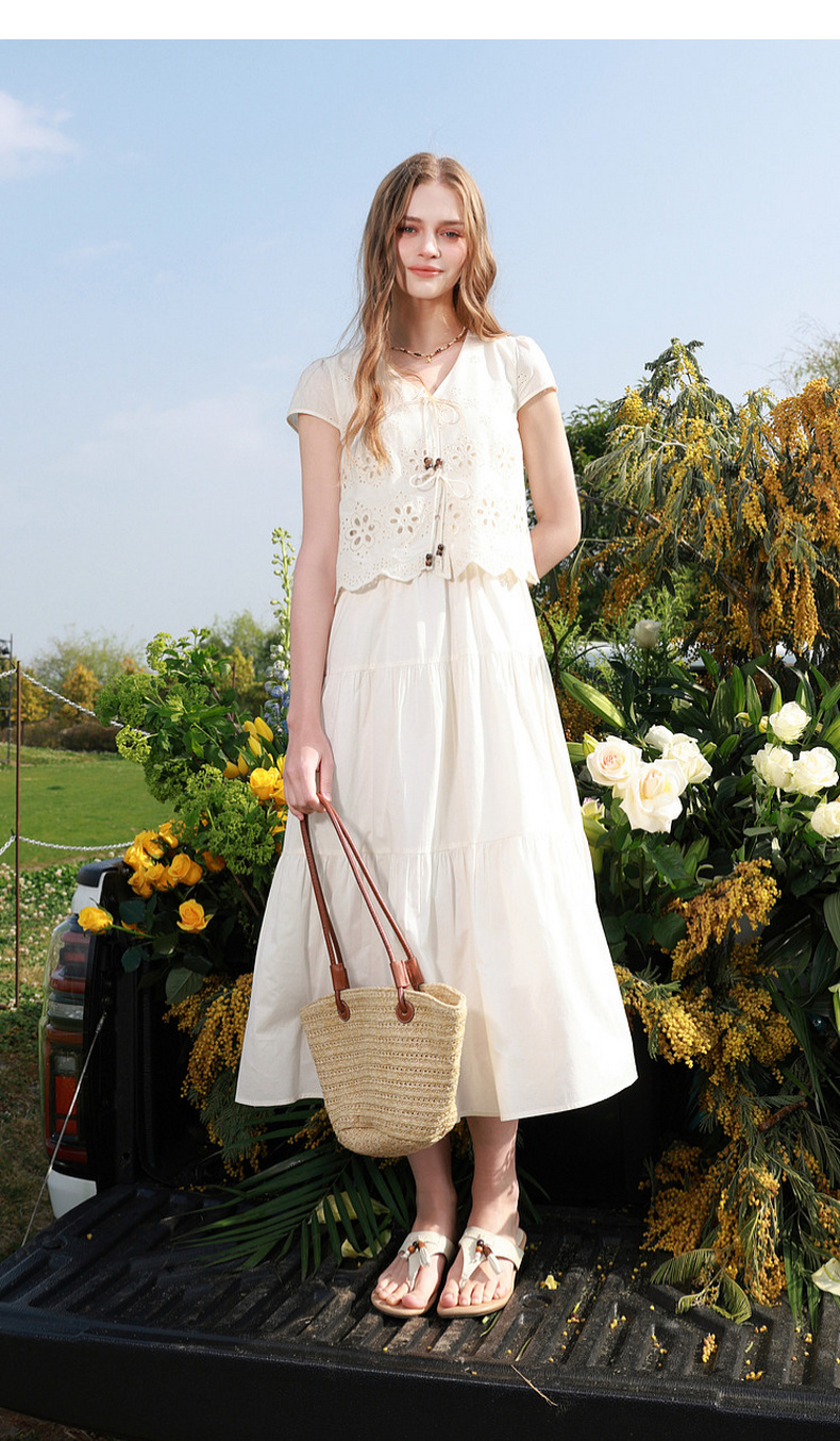 【小樱花连衣裙】三彩2026夏季新款纯棉绣花短袖V领A字裙长裙M