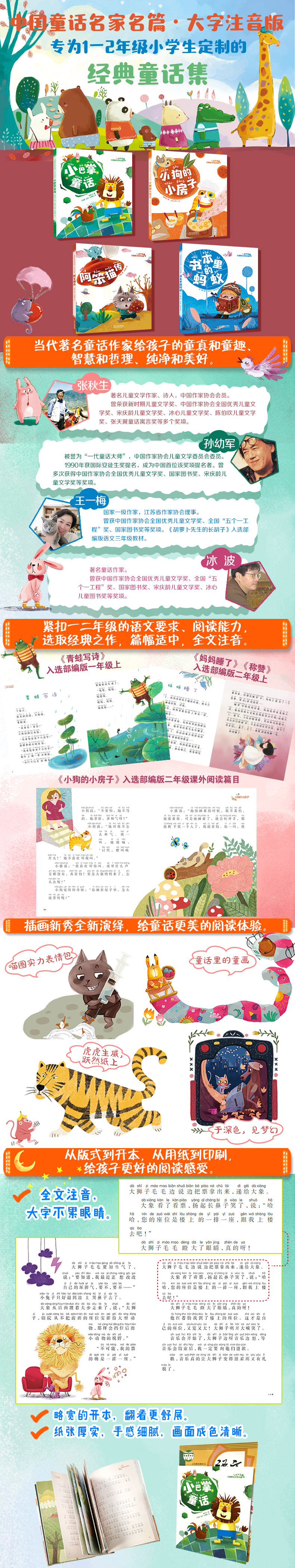 中国童话名家名篇·大字注音版(全四册)包含:小巴掌童话、书本里的蚂蚁、小狗的小房子、阿笨猫传 集当代童话名家,甄选其代表之作 为正文全部注音,配四色精美插图 与语文教材同步,为语文打好基础