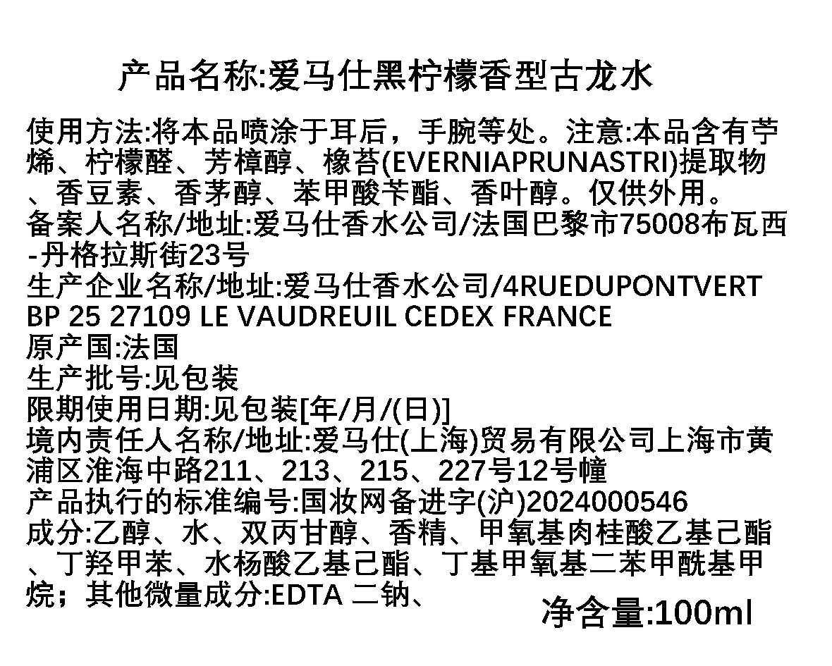Hermes爱马仕 黑柠檬/黑色香橼古龙水香水