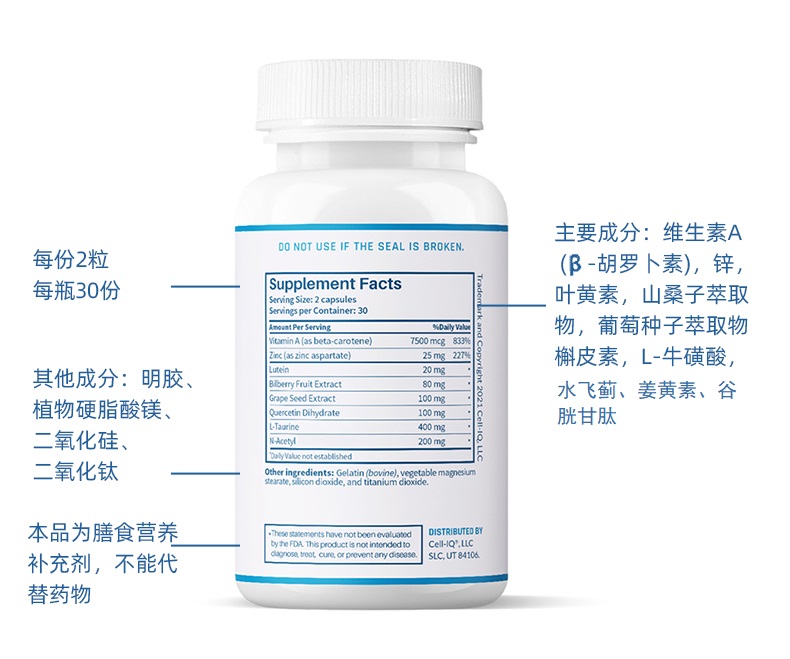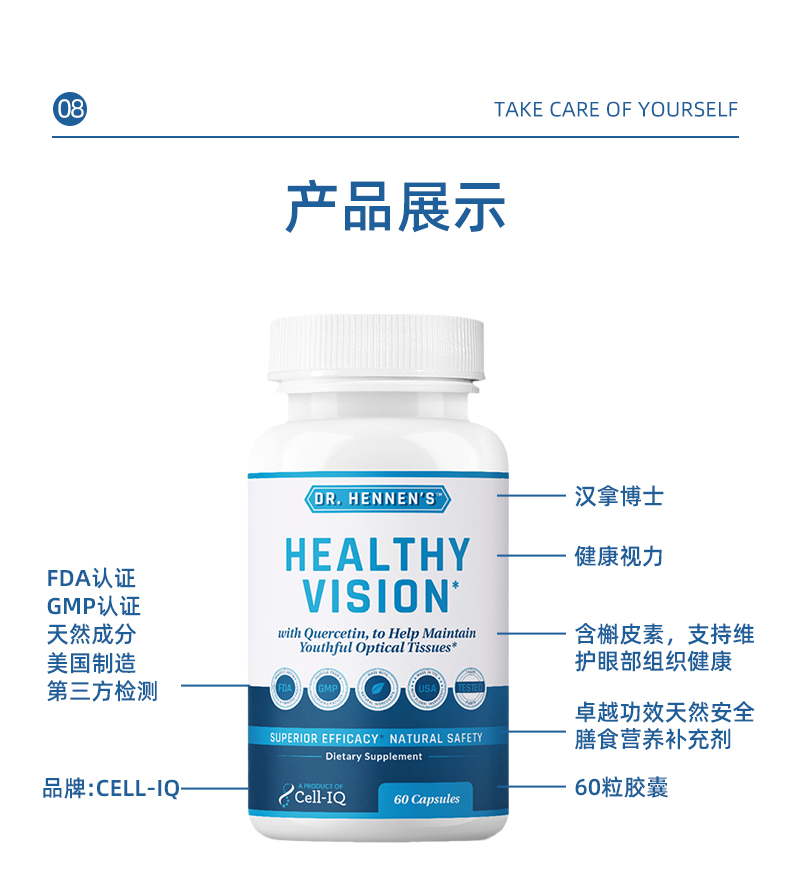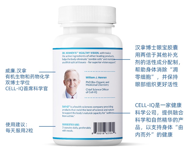 美国Cell-IQ汉拿博士眼宝胶囊Healthy Vision(60粒)防蓝光缓解疲劳眼干黄斑叶黄素槲皮素谷胱甘肽眼睛营养品