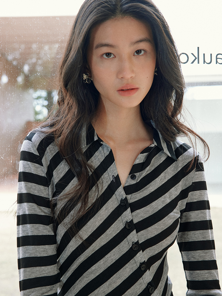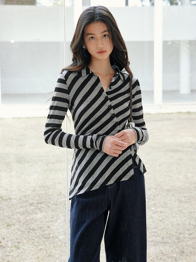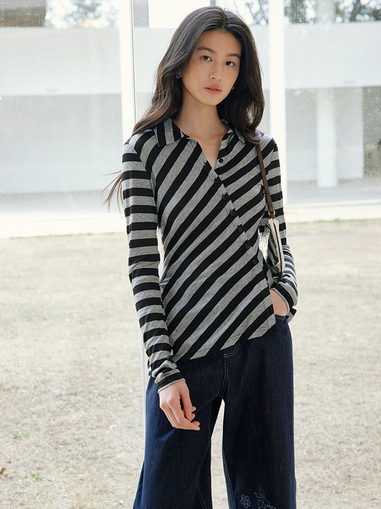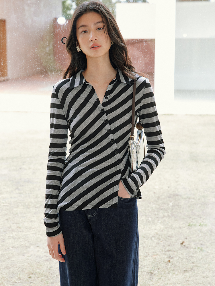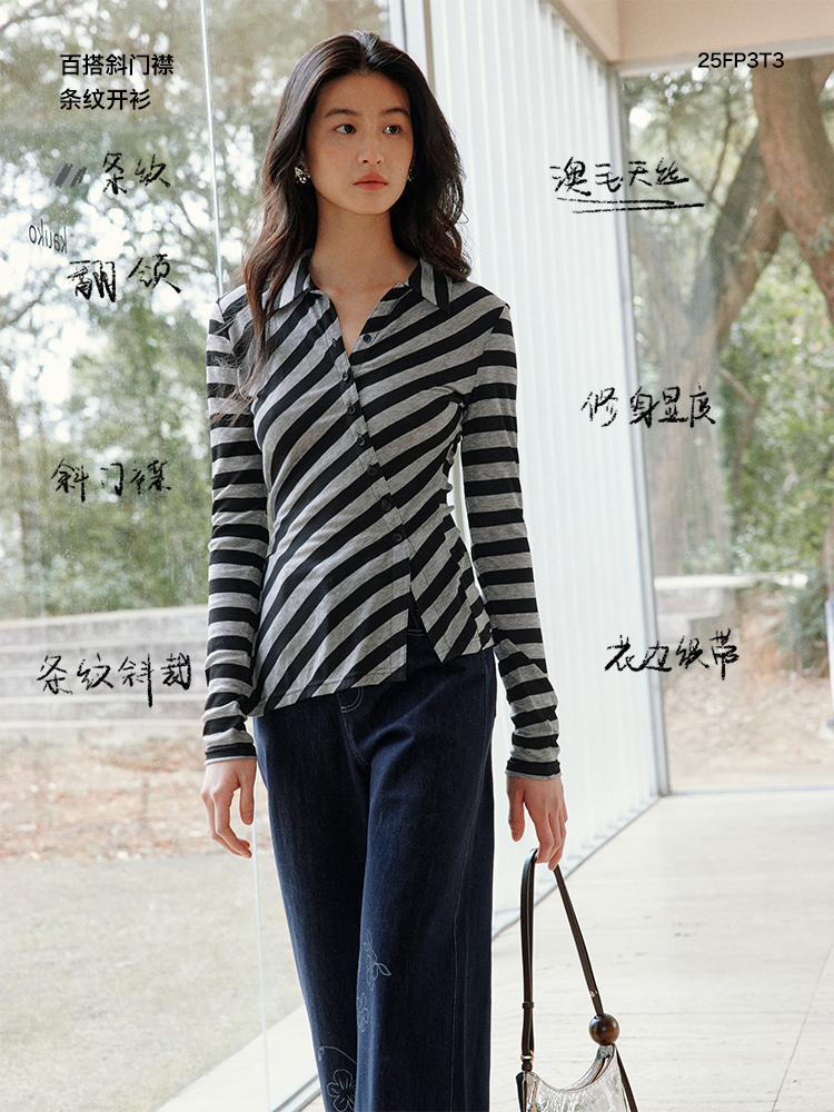 ForPoem 现货 25/SS原创设计百搭显瘦澳毛天丝斜门襟条纹开衫