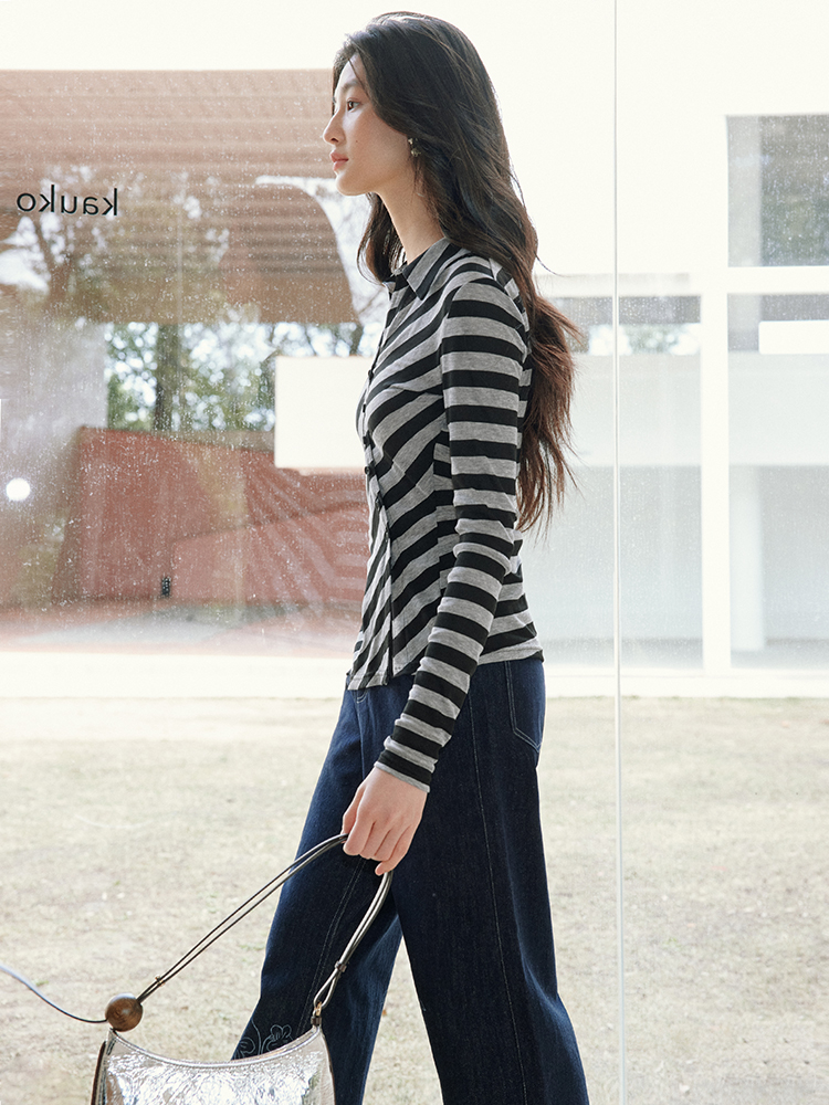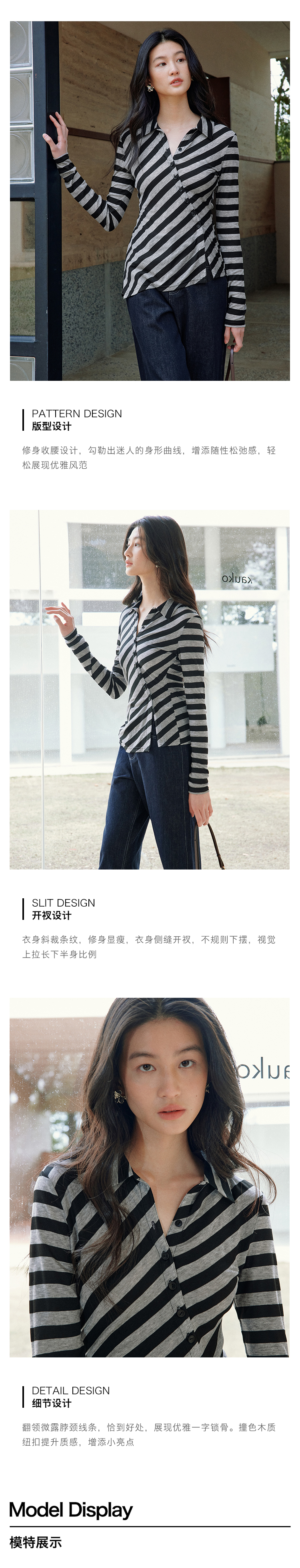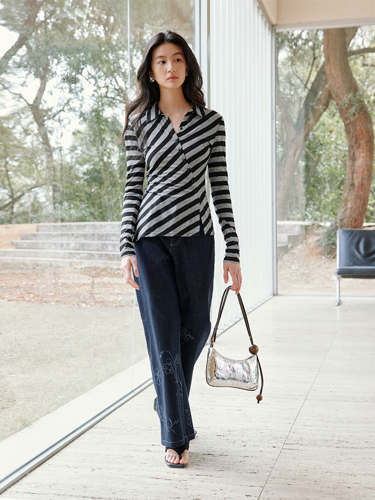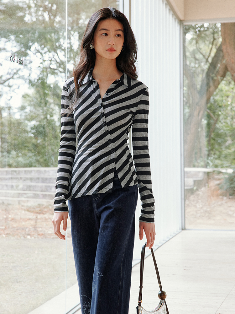 ForPoem 现货 25/SS原创设计百搭显瘦澳毛天丝斜门襟条纹开衫
