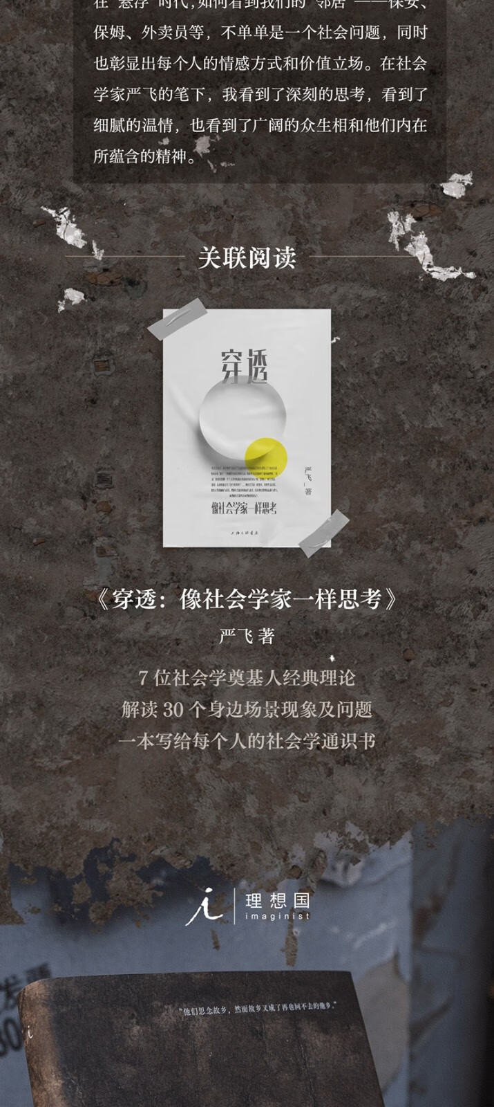 在本书中,严飞以“邻居”身份走进被大的社会盛景忽略的“小世界”——在那里,有装修工、保安、保姆、快递小哥、家政工,等等。他们就在我们“附近”,和我们亲密无间,甚至就在同一家庭内景中,但却因为“悬浮”的身份,被抛入另一语境之中,变为“看不见的人”。在细腻、温暖又充满理性的叙述中,我们可以看到作者的反思、谨慎,感受到作者和写作对象之间彼此敞开的交集时刻,看到一个个完整的、具象的人的命运、疼痛和挣扎。作为一名社会学家,严飞以一贯的敏锐跃出或拓宽学科的限制,他不只是在分析个案、总结规律,他是在讲“邻居”的故事,其实,也就是你我的故事,你我的命运。每一个人都被包含其中。
