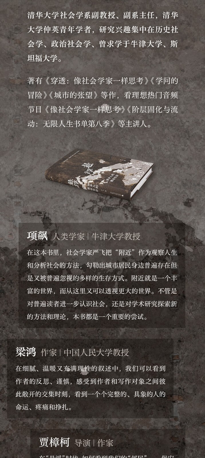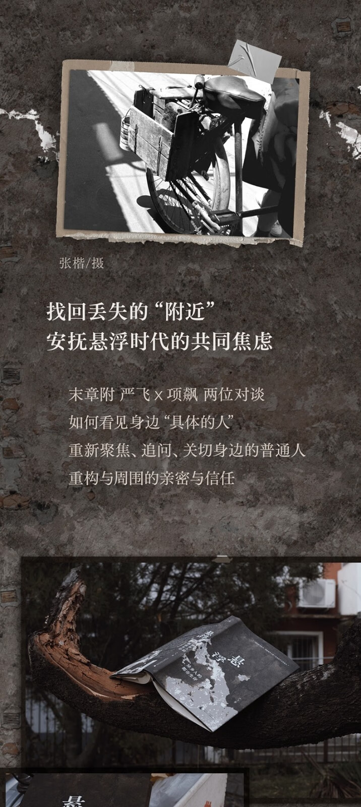 在本书末章,严飞与项飙两位社会学家就“附近”对回归真实生活的巨大意义,与如何看见身边“具体的人”而非“模糊的画像”展开了深刻的对话。通过重新聚焦、追问、关切身边的普通人的故事,作者呼吁我们找回在现代社会中每个人正在丢失的“附近”。而重构与周围的亲密与信任,是安抚每个不确定的、悬浮的现代人的一剂良药。