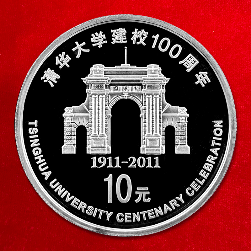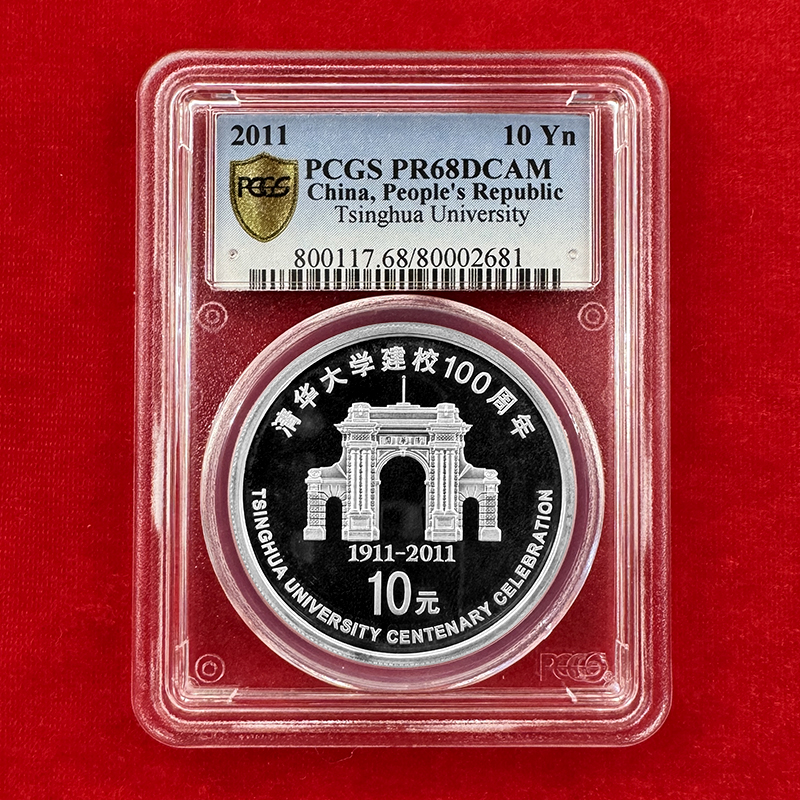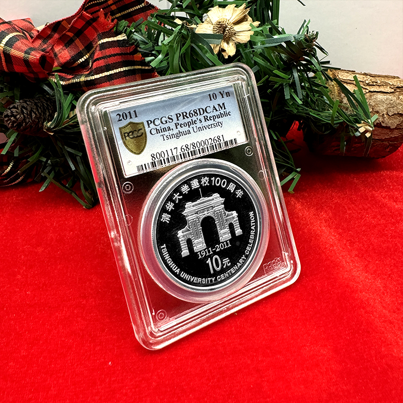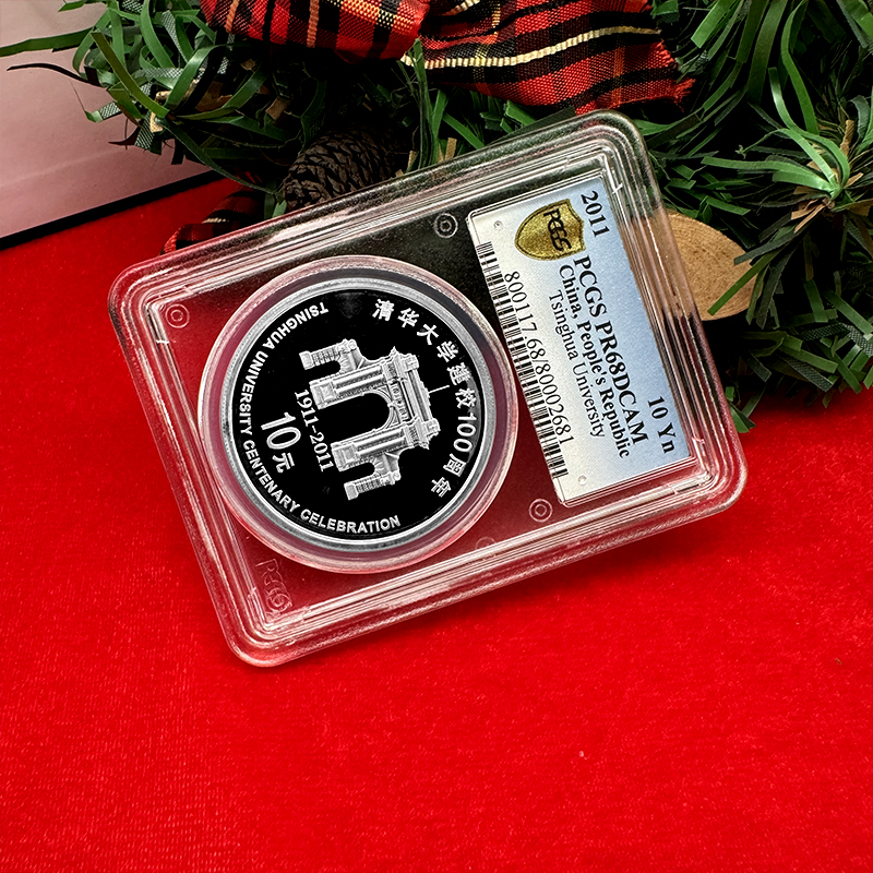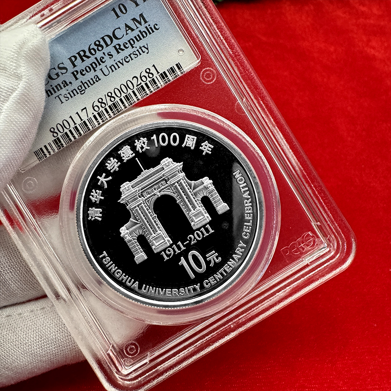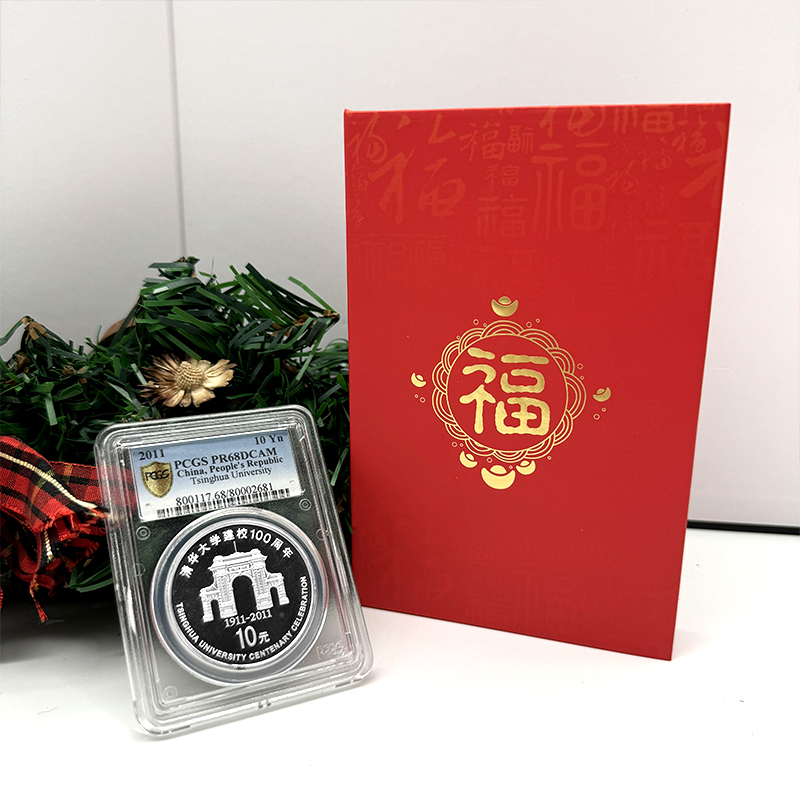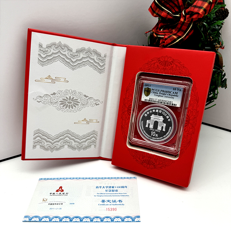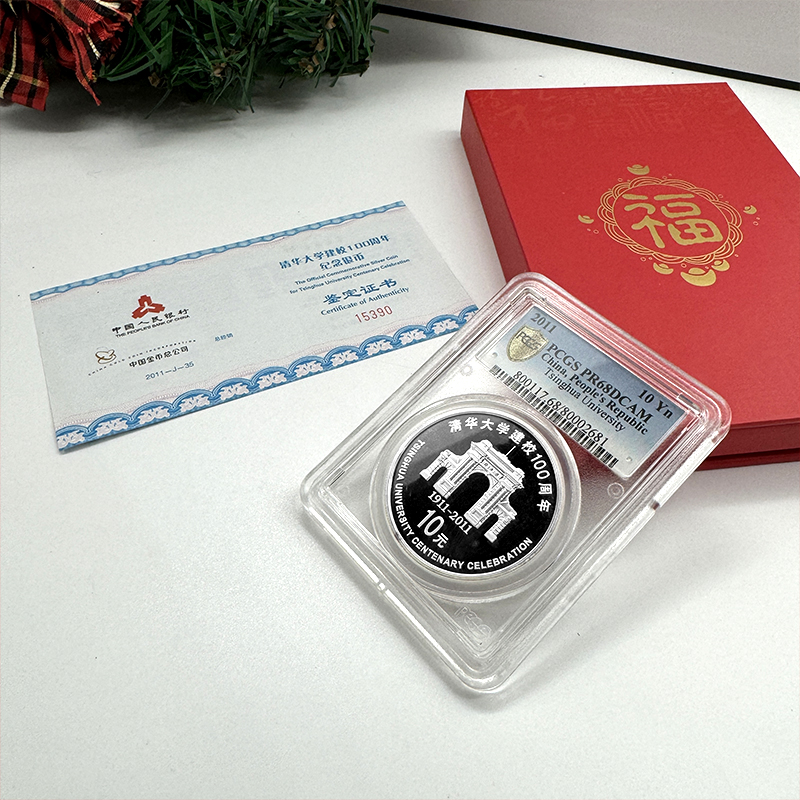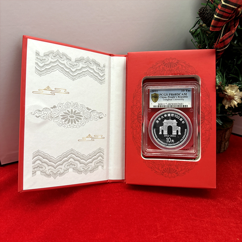 清华大学建校100周年银币 pcgs评级 带礼盒礼袋