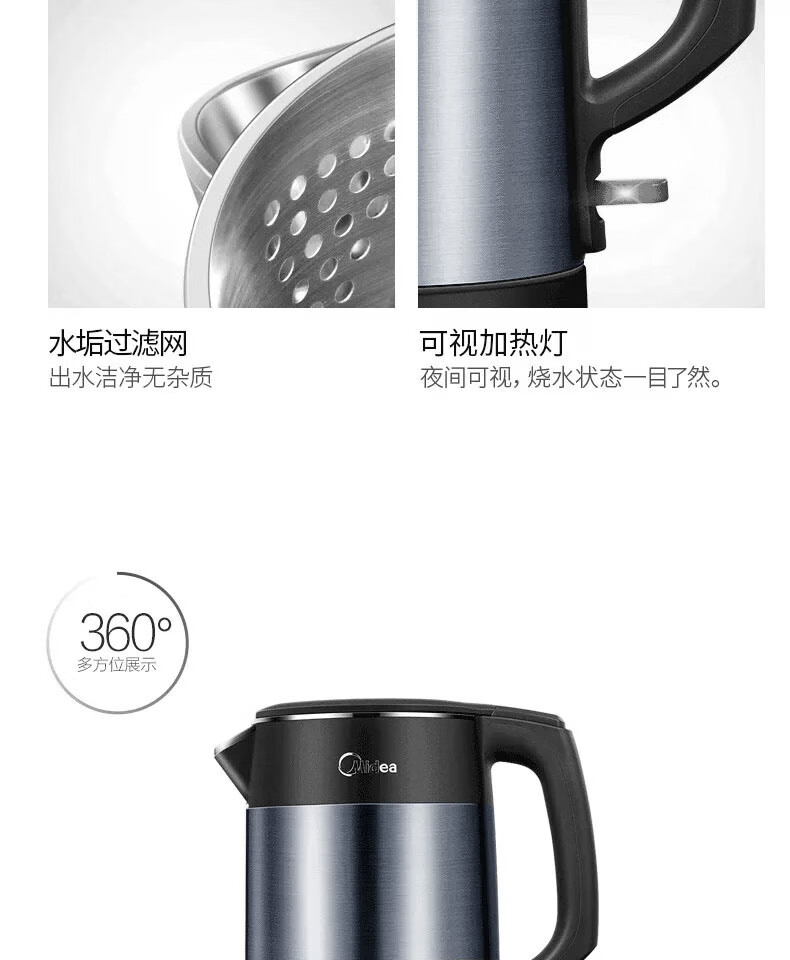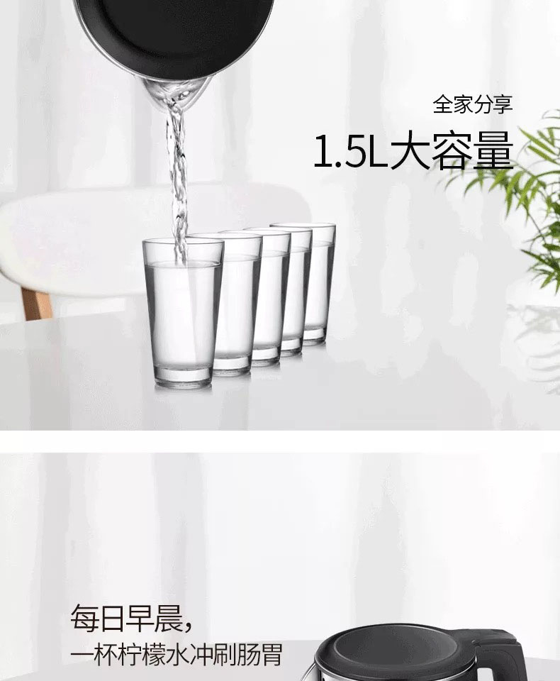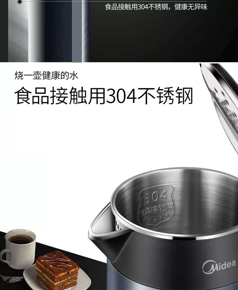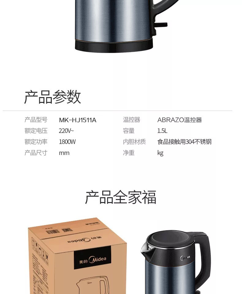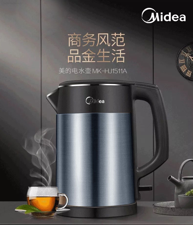 美的(Midea)电热水壶 双层防烫电水壶 烧水壶1.5升容量 食品级304不锈钢 HJ1511a