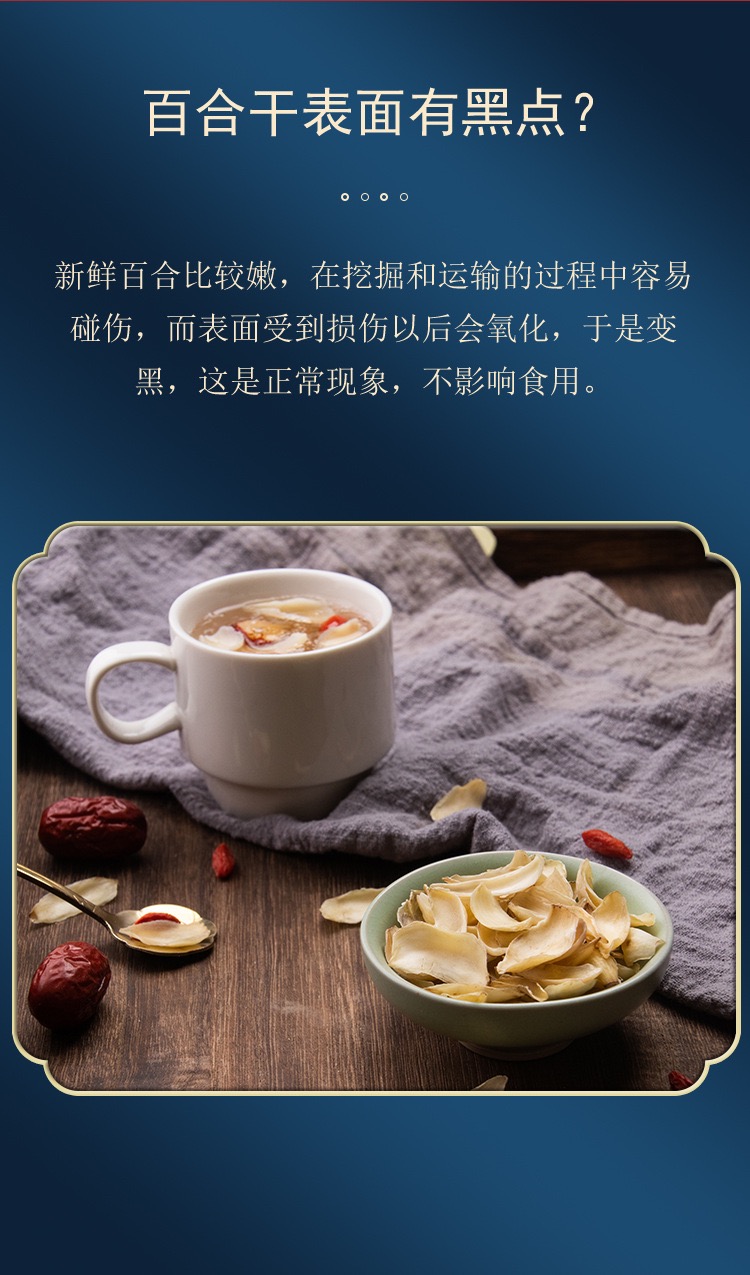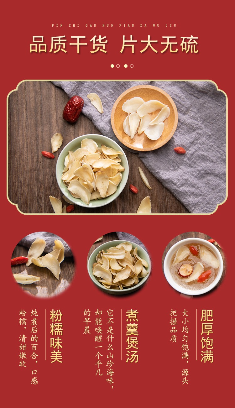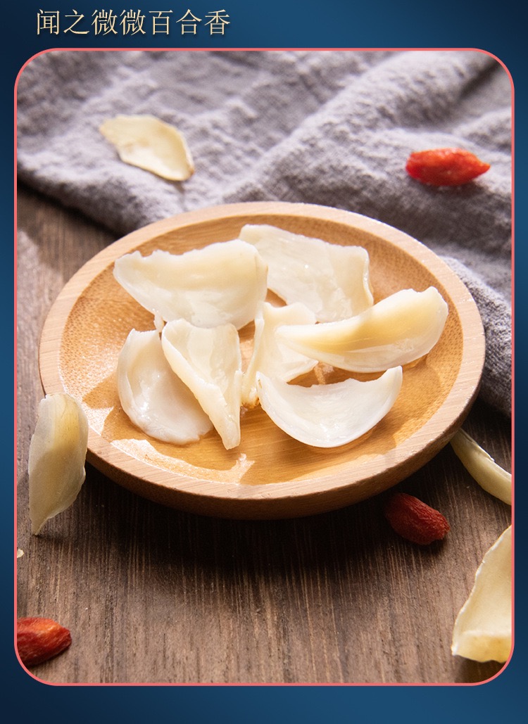 百合干颜色是偏黄的,而硫熏过的百合外观看上去接近于白色,闻之有一股刺鼻味,口尝发现味道很酸;