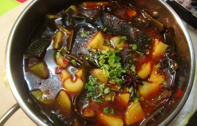 1.海带提前泡发,热锅温油,小火下豆瓣酱煸炒出香味1分钟。