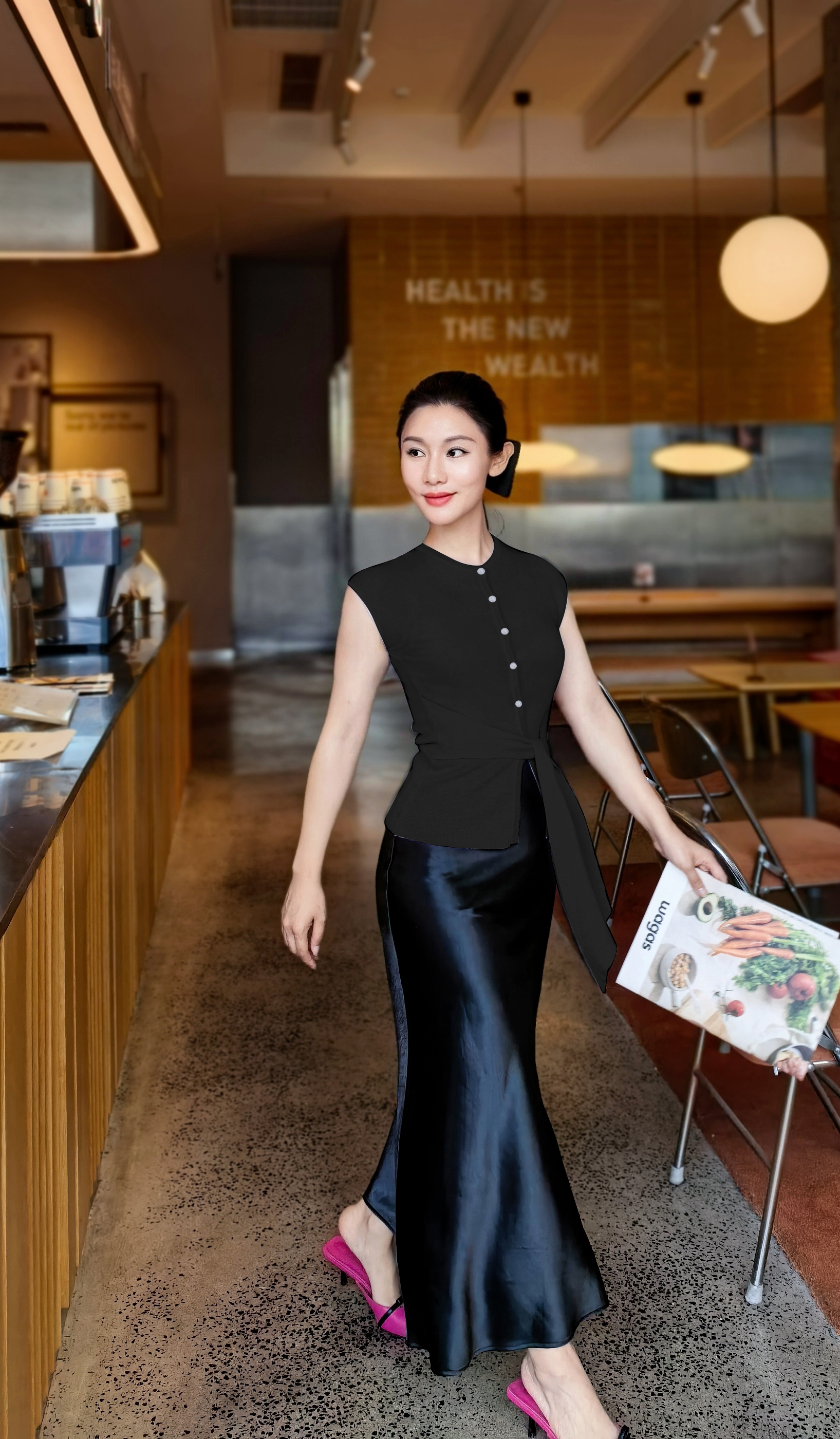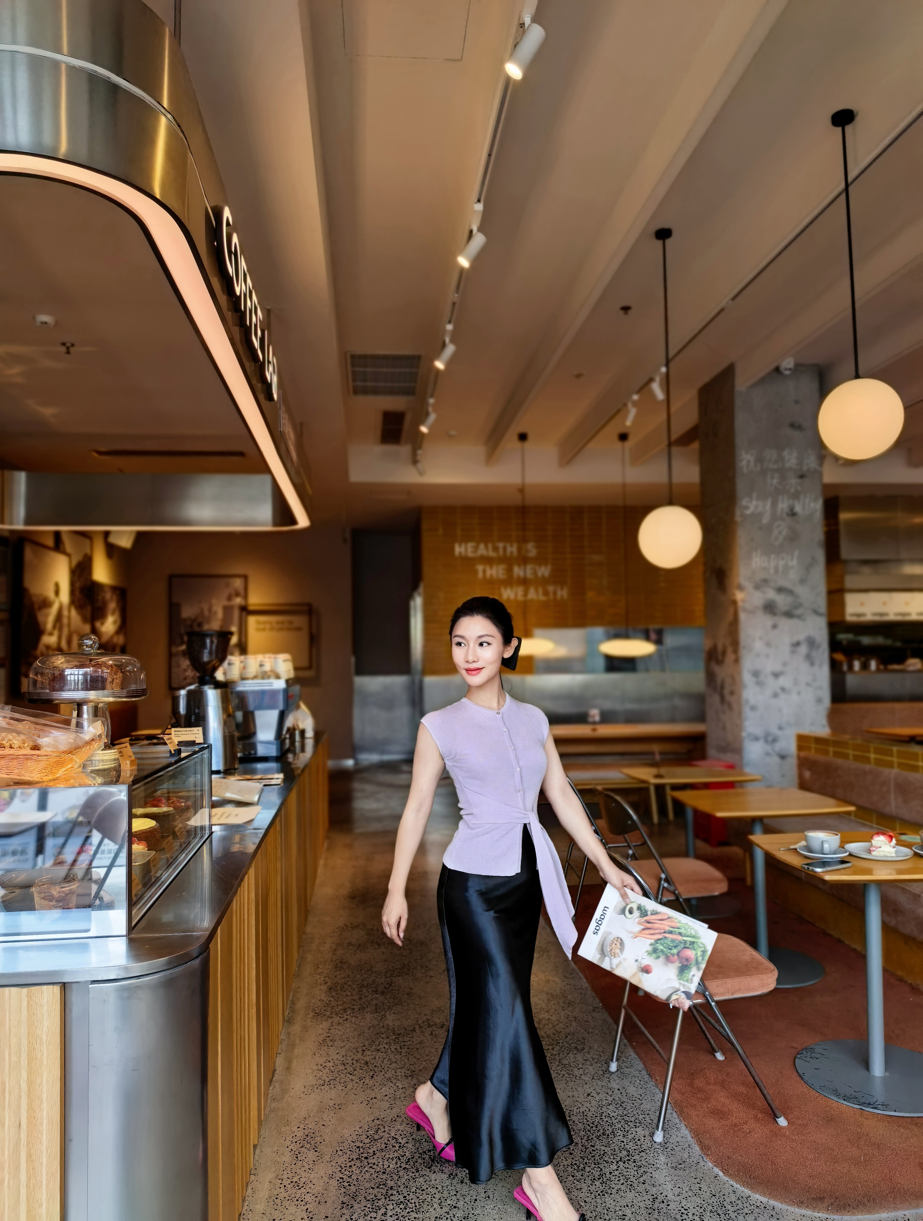 包肩袖设计:采用45°微斜裁剪,既保留了传统包肩袖修饰肩颈线条的优势,又通过斜向延伸的针法打破平面感,视觉上拉长手臂线条,尤其适合肩宽或上半身丰满的女性。