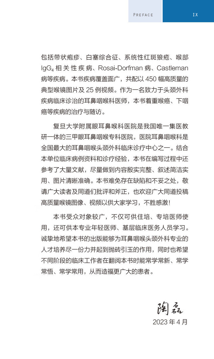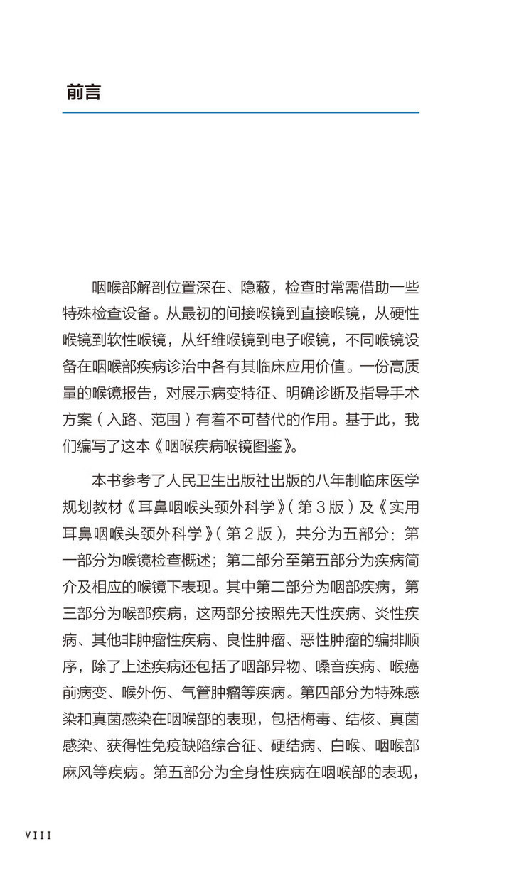 本书主体分为两部分:第一部分是喉镜检查概述,系统介绍了喉镜分类、临床应用价值、标准检查方法及设备消毒与养护等;第二部分为全书主体和重点,以图说的形式全面介绍了近70种咽喉科疾病的喉镜下表现,手册中涵盖的病种全面,涵盖了咽喉科的全部疾病。同时在硬性喉镜图片基础上,对于肿瘤性疾病针对性配以NBI内镜图,嗓音功能性疾病针对性配以频闪喉镜视频。本书力求以形式达到喉镜检查“一册在手,诊断无忧”的目的,为广大耳鼻喉科住院医师、低年资医师、规培生及研究生提供一便携、简洁明了的咽喉疾病的喉镜诊断“口袋书”。