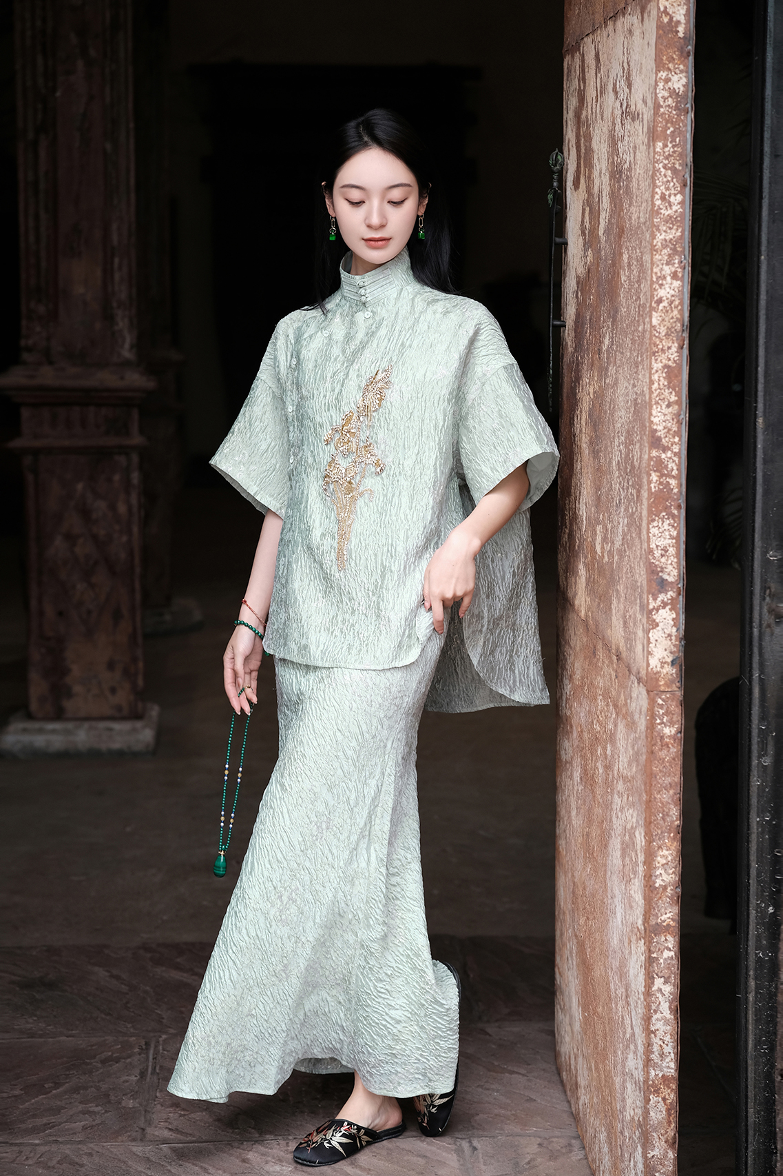 盛唐牡丹 |真丝提花阔腿裤珍珠白平腰版 (蝶恋花纹样)