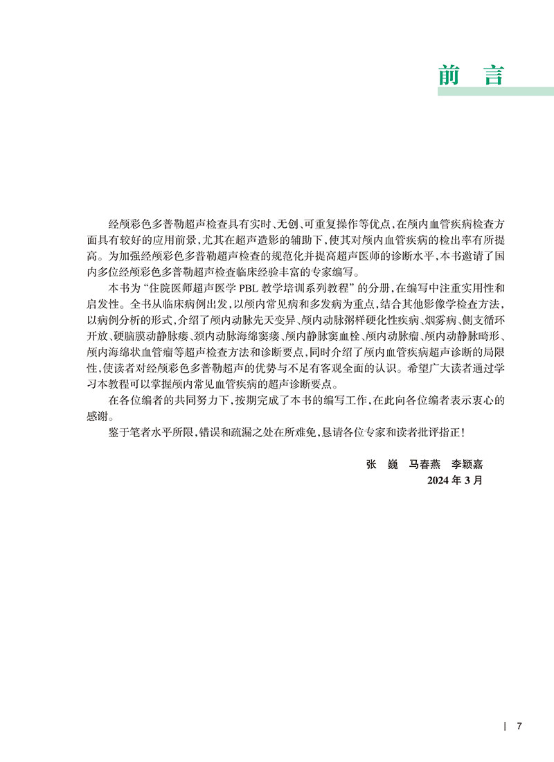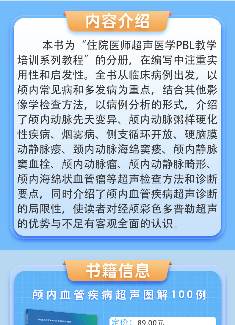 本书为“住院医师超声医学PBL教学培训系列教程”的分册,在编写中注重实用性和启发性。全书从临床病例出发,以颅内常见病和多发病为重点,结合其他影像学检查方法,以病例分析的形式,介绍了颅内动脉先天变异、颅内动脉粥样硬化性疾病、烟雾病、侧支循环开放、硬脑膜动静脉瘘、颈内动脉海绵窦瘘、颅内静脉窦血栓、颅内动脉瘤、颅内动静脉畸形、颅内海绵状血管瘤等超声检查方法和诊断要点,同时介绍了颅内血管疾病超声诊断的局限性,使读者对经颅彩色多普勒超声的优势与不足有客观全面的认识。