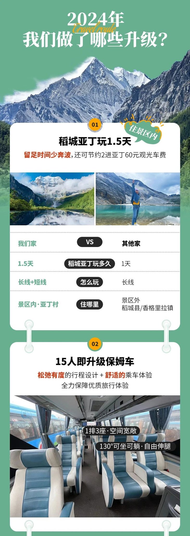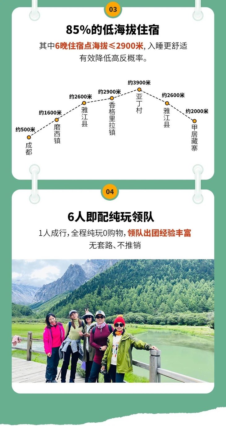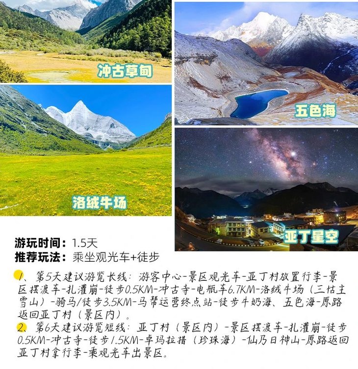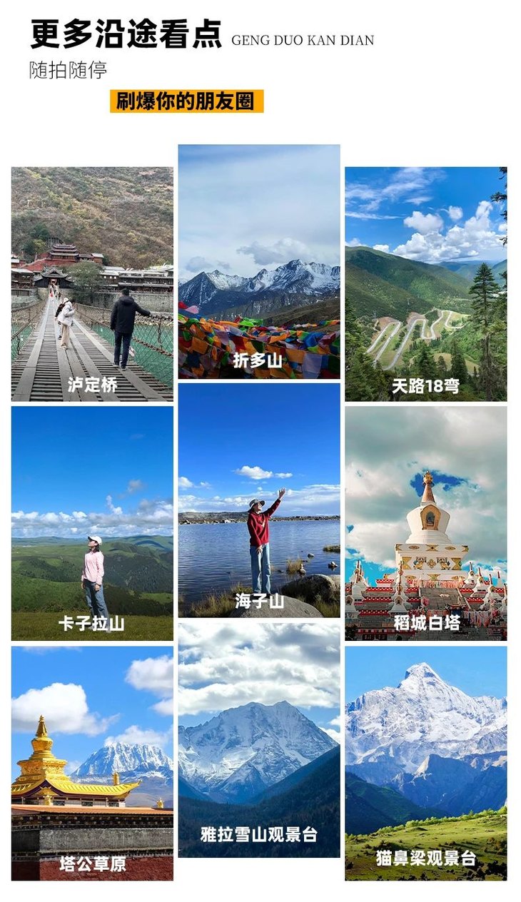 4、门票:四姑娘山观光车70元/人(必须),甲居藏寨观光车35元/人(必须),稻城亚丁观光车120元/人(必须)、稻城亚丁游览车70元/往返(可选),墨石公园观光车20元/人(必须),海螺沟观光车70元/人(必须)、海螺沟索道135元/人(可选)、海螺沟电瓶车30元/人(可选),泸定桥上桥门票10元/人(可选);