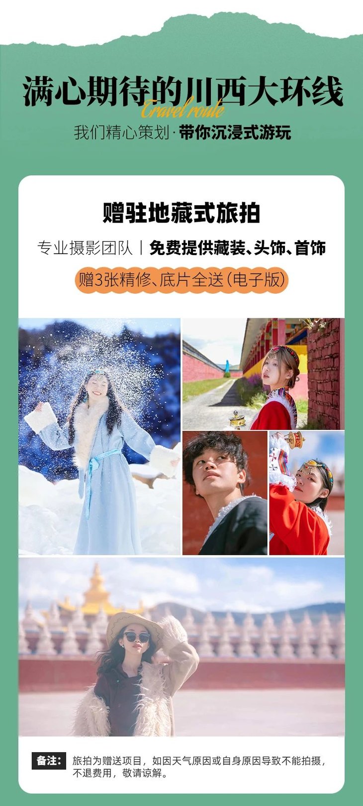 (1)驻地藏式旅拍:免费提供藏装/首饰/头饰,赠3张电子版简修,底片全送;