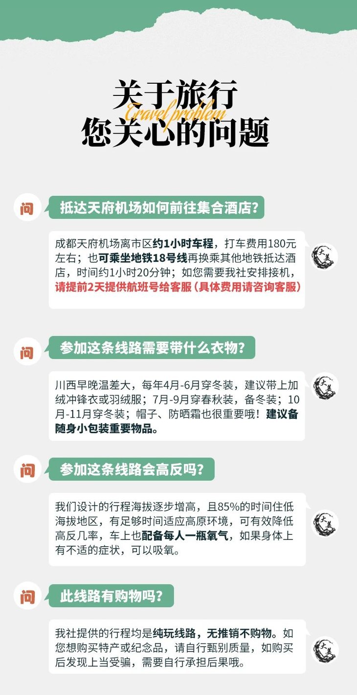 (5)建议队员们在集合日抵达成都后,可在市区采购一些旅行用品,如零食、佐餐小菜、药品等。