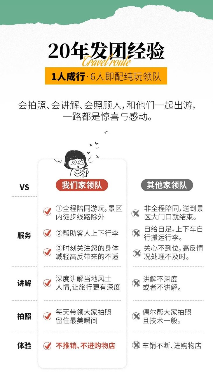 4、领队:优秀领队服务(1-5人司机兼向导,6人及以上配专职领队,已含领队食宿门票);