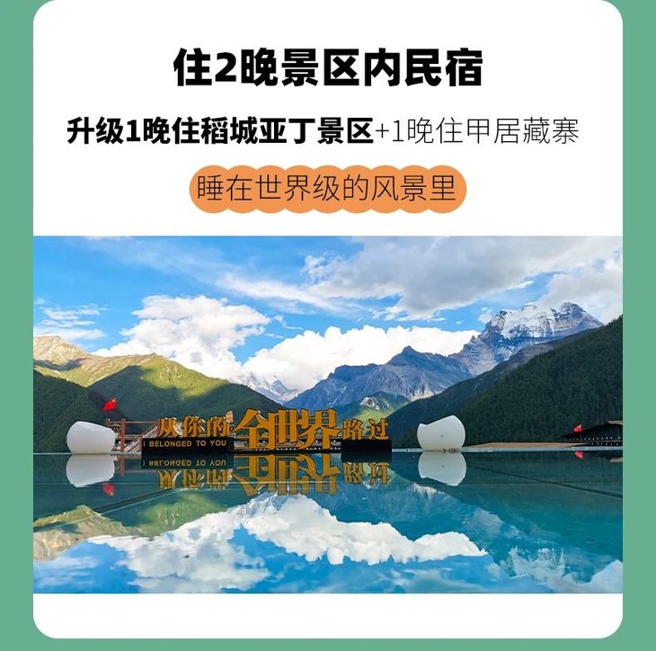 3、门票:海螺沟门票、四姑娘山双桥沟门票、甲居藏寨门票、稻城亚丁门票、墨石公园门票、勒通古镇门票及观光车;