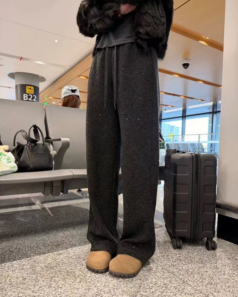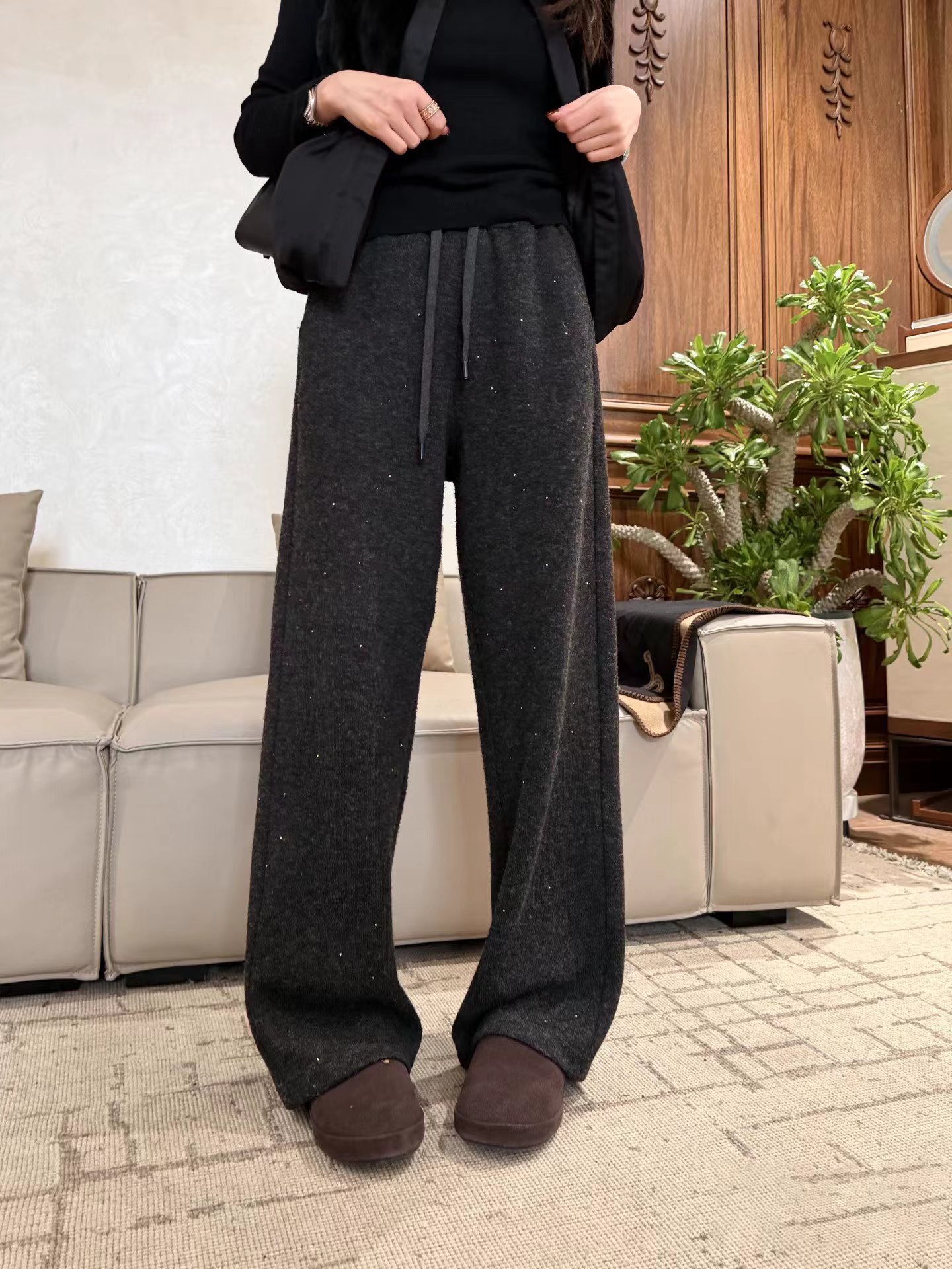 冬季星河亮片加绒加厚保暖宽松直筒垂顺羊毛阔腿裤,简奢星河亮片羊毛混纺休闲裤!亮片是织进面料里的,非常柔软亲肤,宽松直筒精典版型,包容任何腿型,兼具垂感,挺阔度和保暖度为一身,舒适感爆棚!加厚毛呢,挺阔有型,篙及感穿搭,选用羊毛混纺面料,厚度刚刚好,拿在手上也是很有分量,手感摸起来软糯有质感,很舒适细腻!亮片混织,亮片和面料织一起的,纱线是通过te殊工艺处理!行走间裤身轻盈流动,如此柔软还带点绵滑的感觉,简直做出了精髓!做工也是细节满分,同色系抽绳+松紧腰设计,宽幅弹力松紧腰设计,不限腰围,不易翻扭,不勒肚子,贴合腰腹,久穿不乱跑;中间穿插抽绳,可自由调节穿着舒适贴心!内里做加绒,很保暖!裤长不压身高,垂顺直筒版,包容度qiang,不挑腿型,穿出优越大长腿!高个/小个都不挑喔!