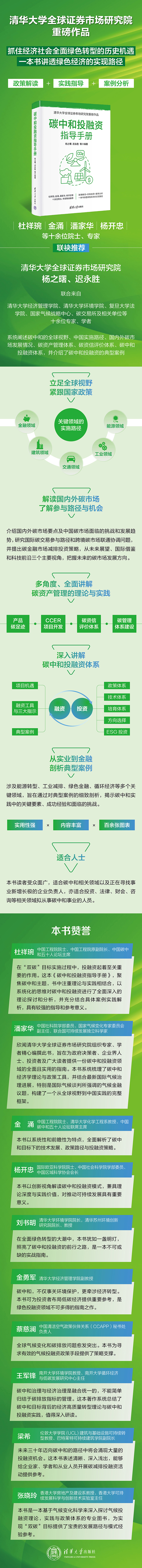 本书由清华大学全球证券市场研究院组织,联合来自清华大学经济管理学院、清华大学环境学院、复旦大学法学院、国家气候战略中心、相关碳交易所以及相关单位等十余位专家、学者,共同打造的适应全面绿色转型时代的碳中和投融资指导手册。