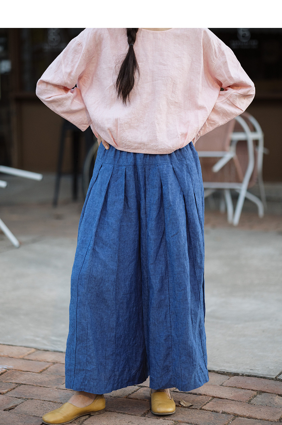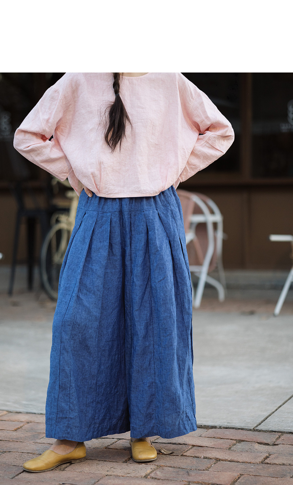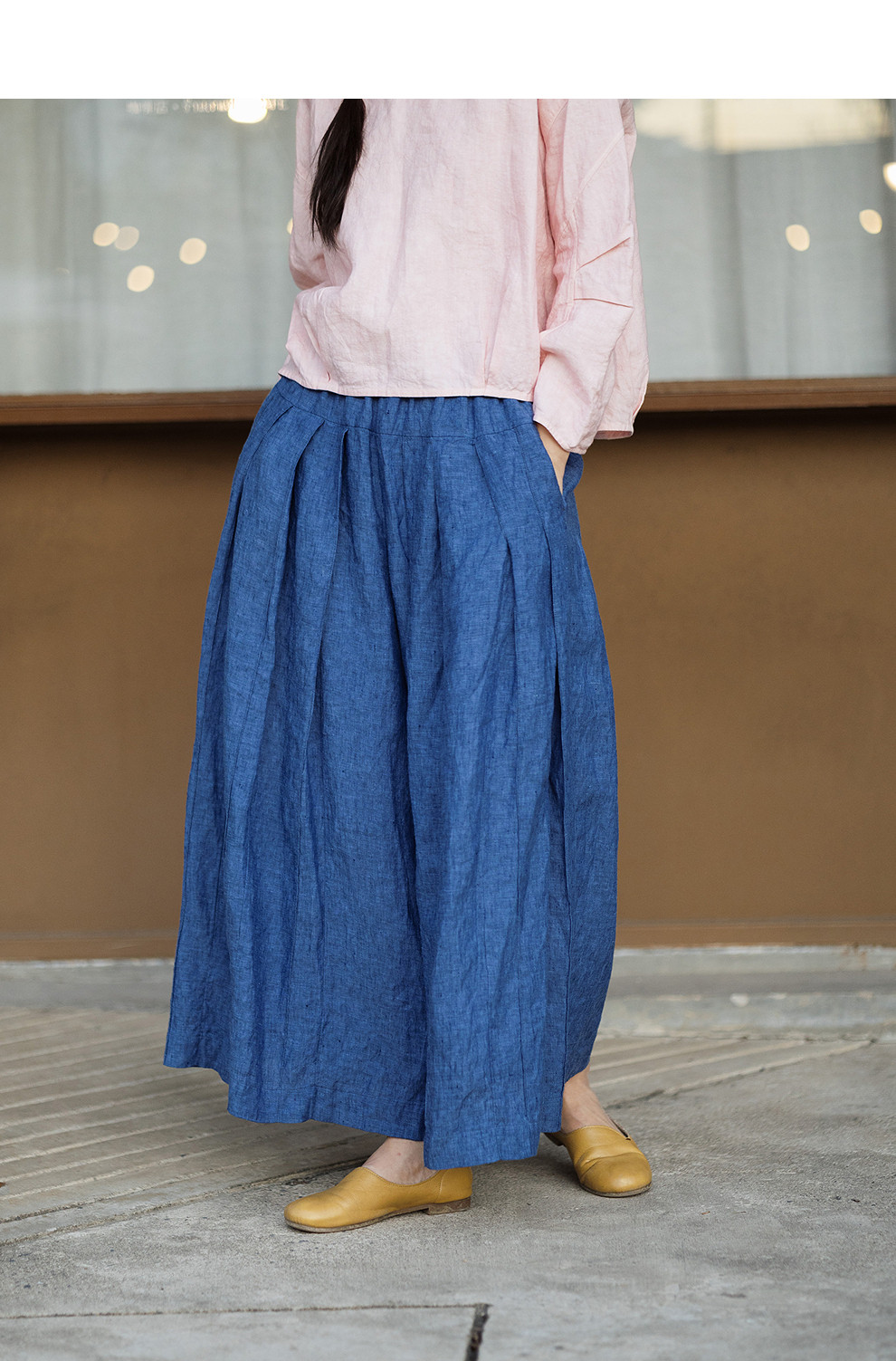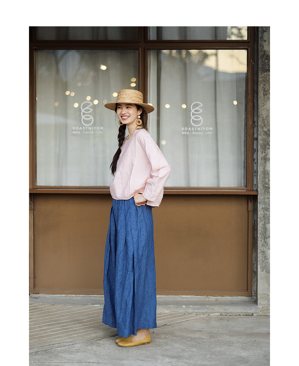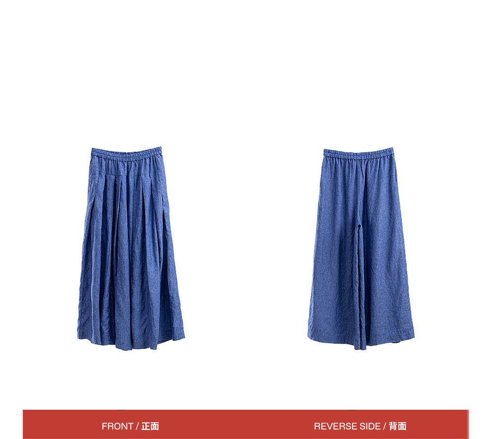 绽放147朵/蓝调*色织亚麻全腰松紧手工压褶裙裤女宽松阔腿休闲裤
