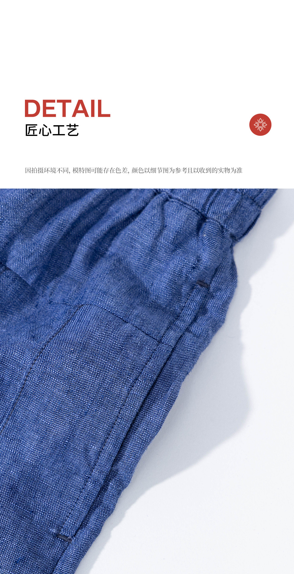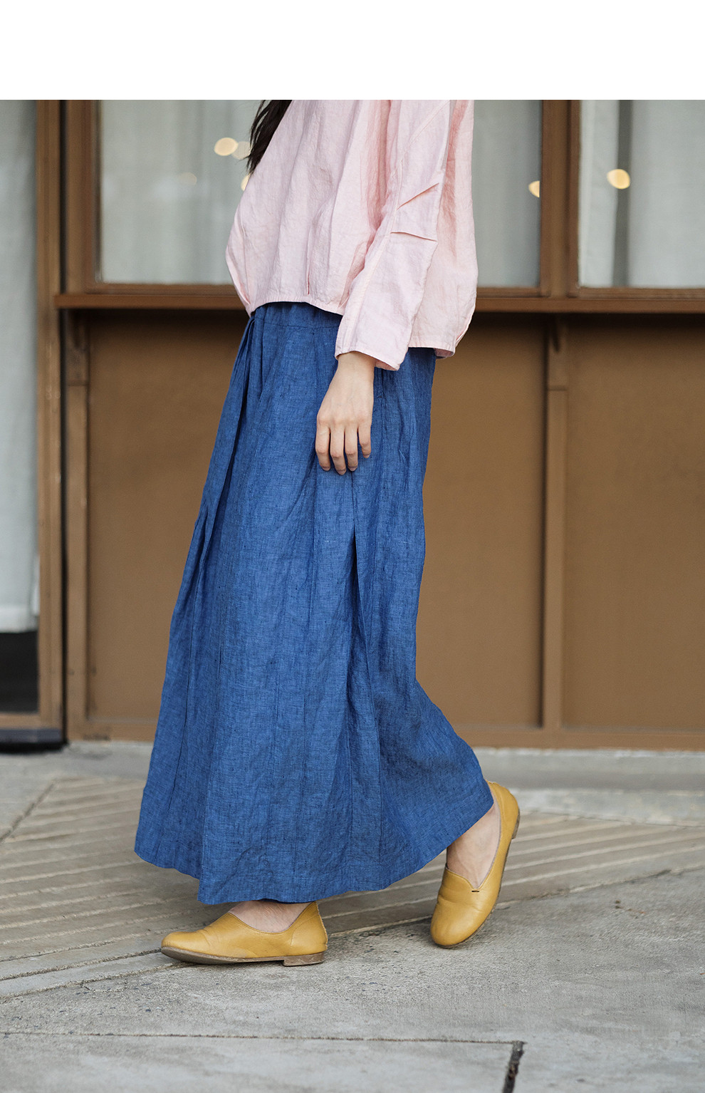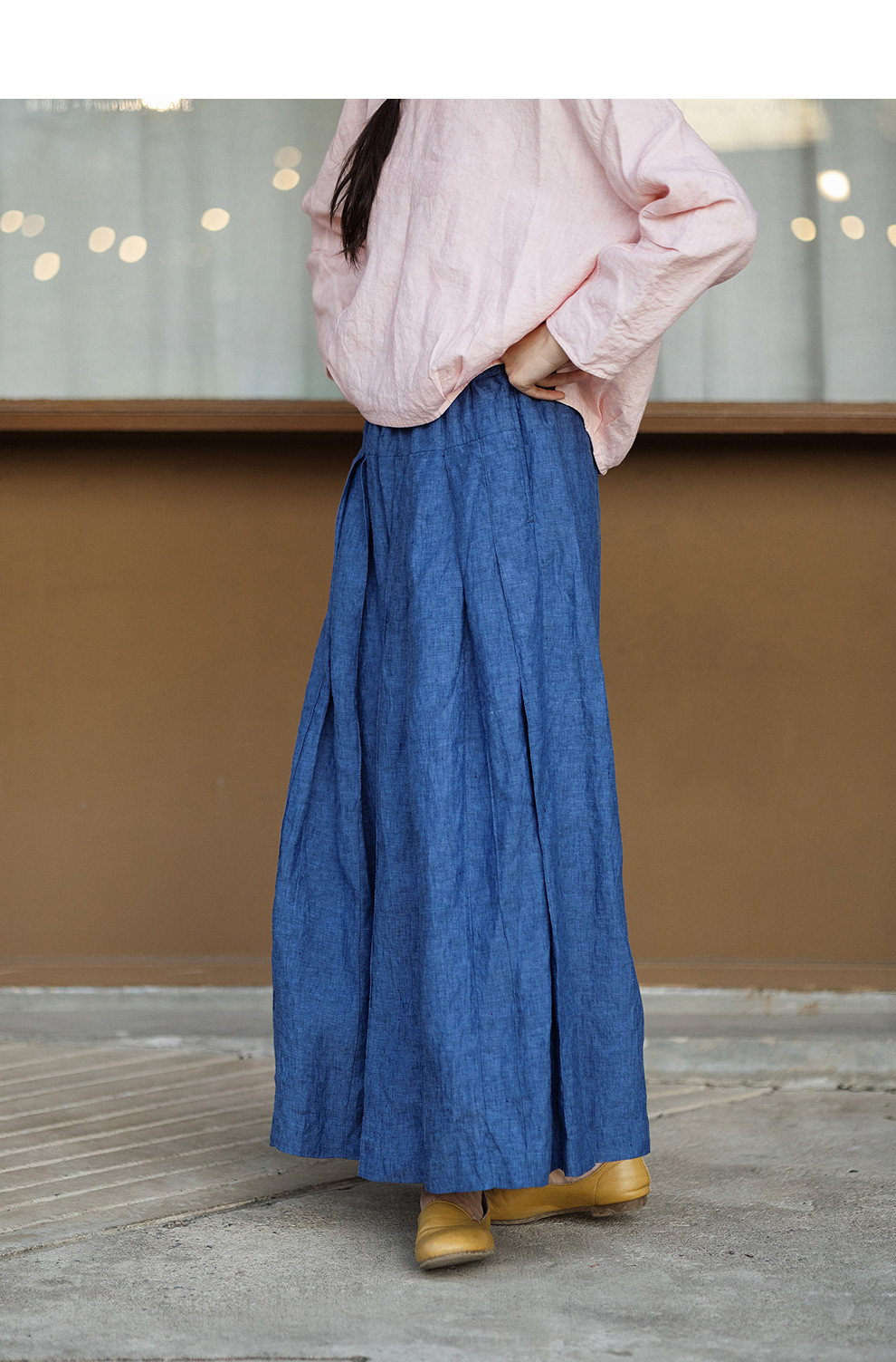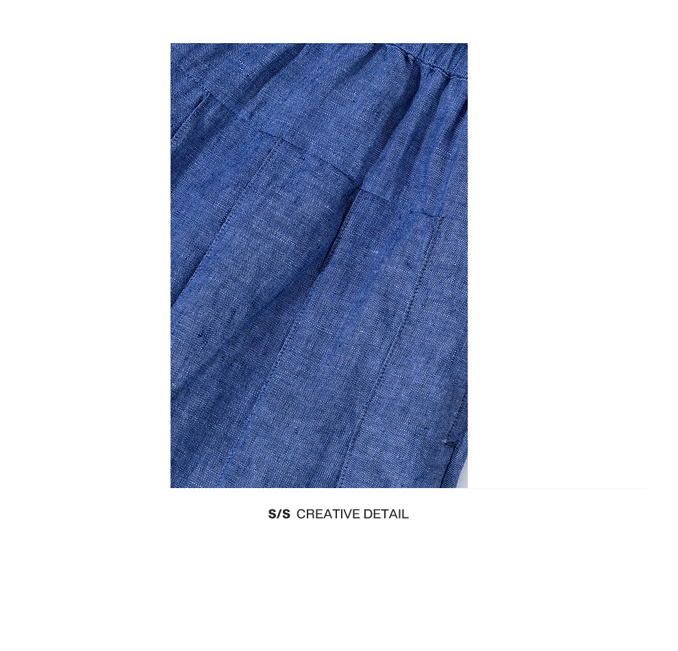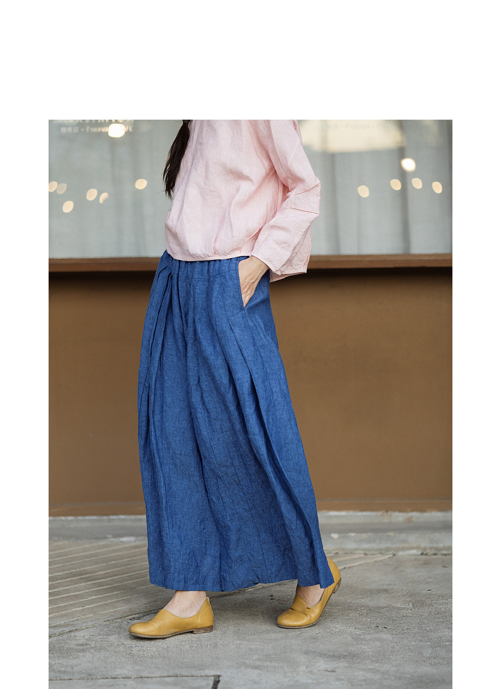 绽放147朵/蓝调*色织亚麻全腰松紧手工压褶裙裤女宽松阔腿休闲裤