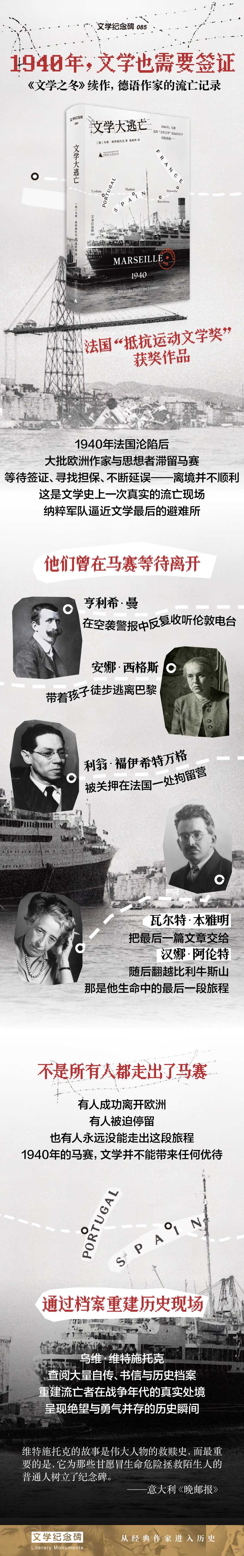 这1940年,德国文学史上最富戏剧性的一年:德军大举入侵法国。在尼斯,亨利希曼在声声空袭警报中收听伦敦电台新闻。安娜西格斯带着孩子徒步逃离巴黎。纳粹党卫队步步逼近时,利翁福伊希特万格正关押在法国一处拘留营。这些人最后都涌向了马赛,只为寻找一条通向自由的路。在这里,瓦尔特本雅明将最后一篇文章交给汉娜阿伦特,随即踏上翻越比利牛斯山的逃亡之旅。众多德国和奥地利作家、艺术家、知识分子的命运轨迹,在此交织。也是在这里,瓦里安弗莱与其同伴冒着生命危险,将受迫害者秘密送出境。许多人成功逃脱,一些人未能如愿,还有人干脆放弃,因恐惧而选择自我了断乌维维特施托克深入大量自传、书信等档案资料,还原这一历史现场,呈现流亡者在战争年代中的处境与选择,为;二战历史提供全新视角。