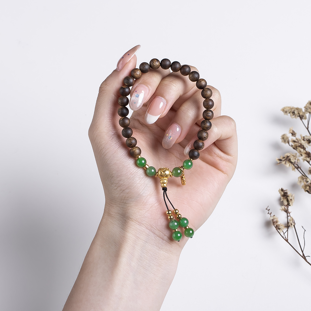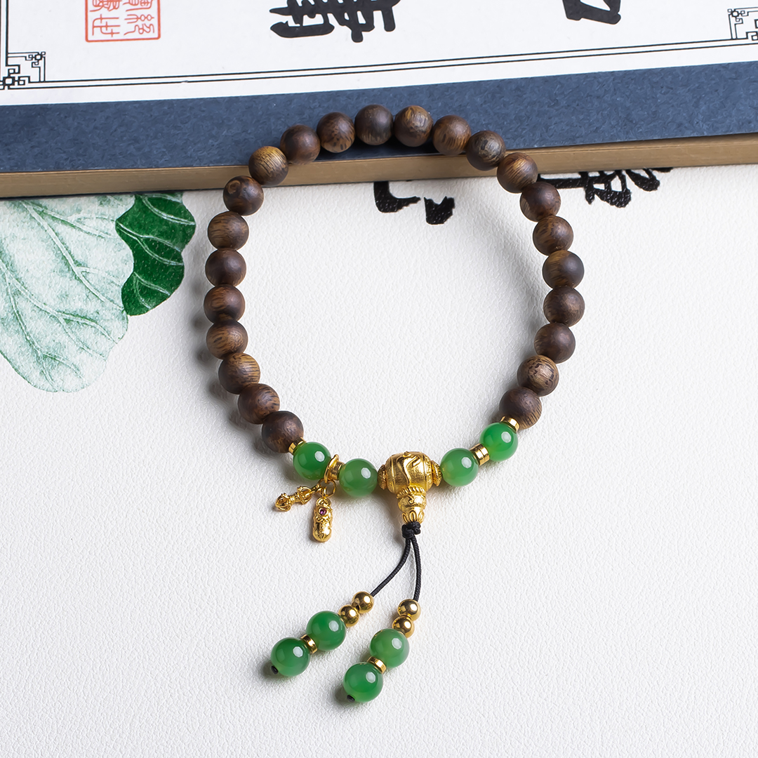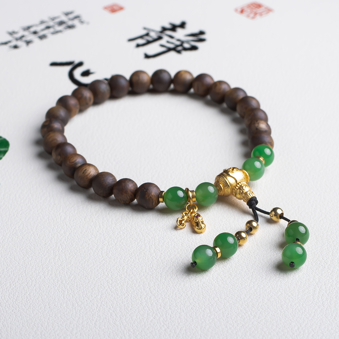 xy0488沉香+碧玉貔貅金刚杵手串.银,天然沉香约6.3mm,原色原味,香味自然清甜,满色波菜绿碧玉搭镀金色银三通、隔珠,还有貔貅、金刚杵小坠,款式典雅时尚,国风设计,吉祥、财富。