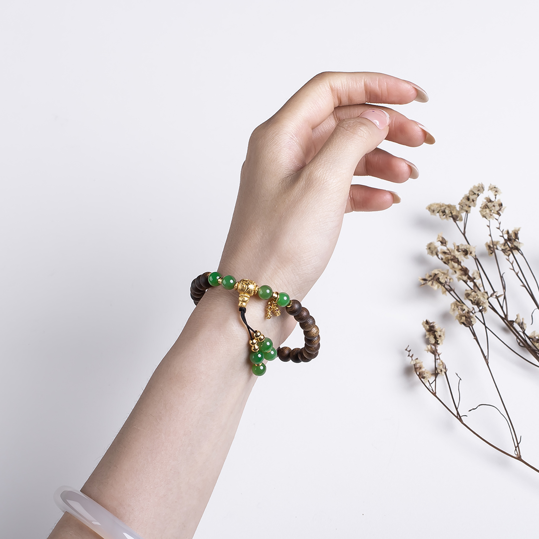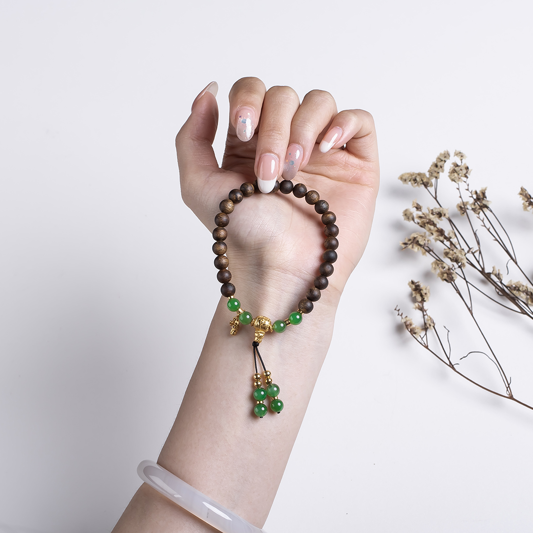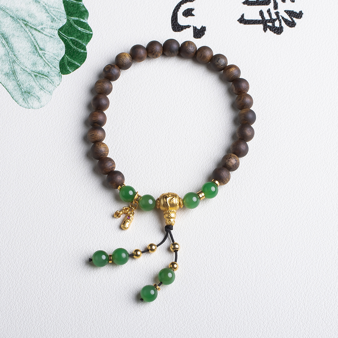 xy0488沉香+碧玉貔貅金刚杵手串.银,天然沉香约6.3mm,原色原味,香味自然清甜,满色波菜绿碧玉搭镀金色银三通、隔珠,还有貔貅、金刚杵小坠,款式典雅时尚,国风设计,吉祥、财富。
