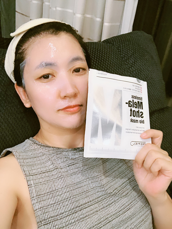 约15分钟后取下面膜,轻拍面部精华至吸收