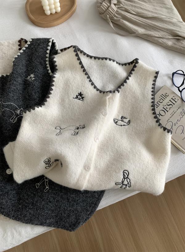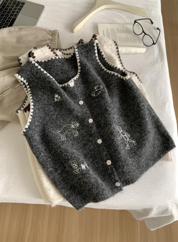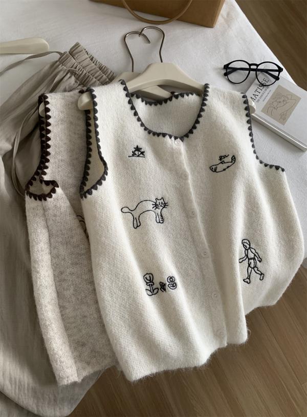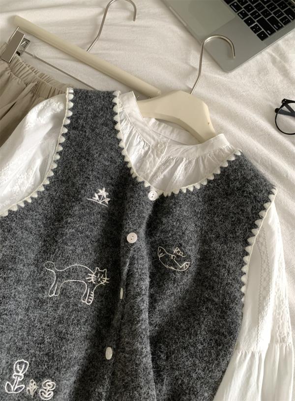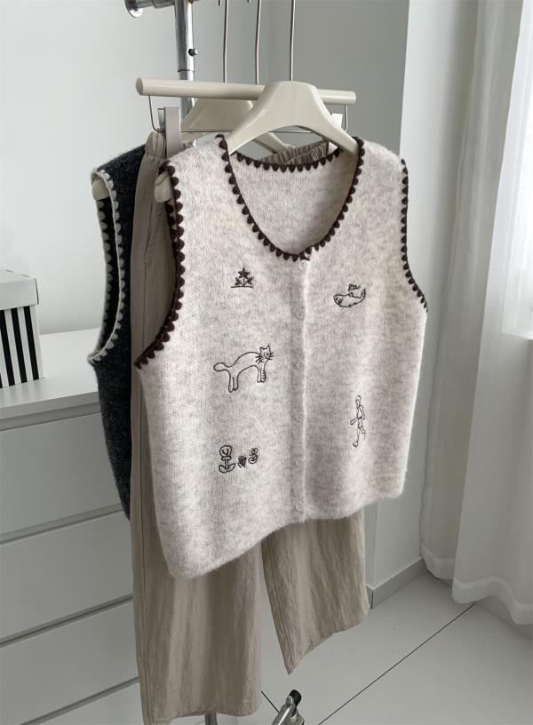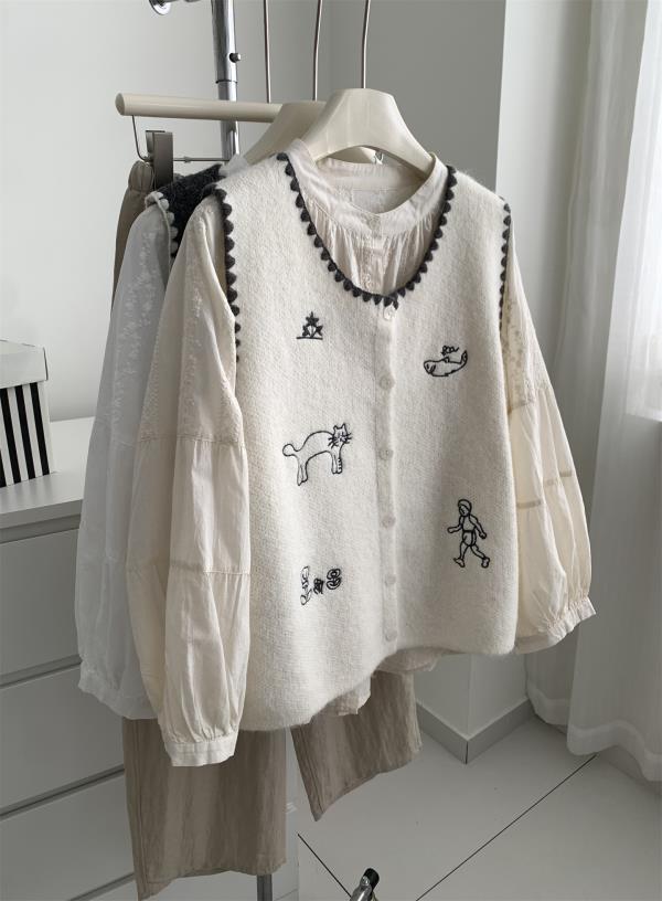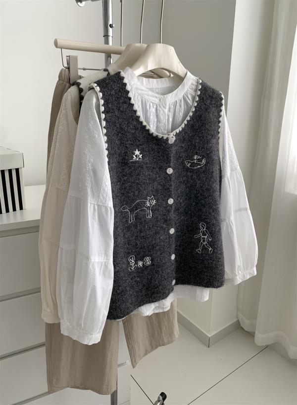 韩系减龄卡通刺绣针织马甲开衫!2025女款设计感花边贝壳扣毛衣背心秋冬~!