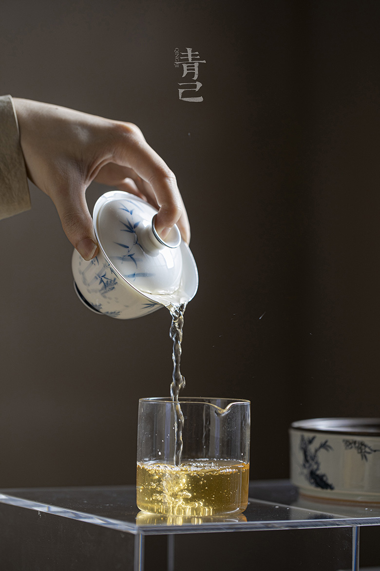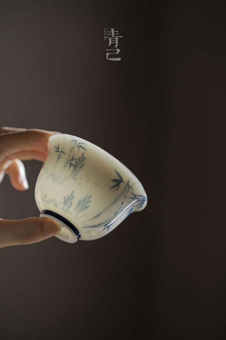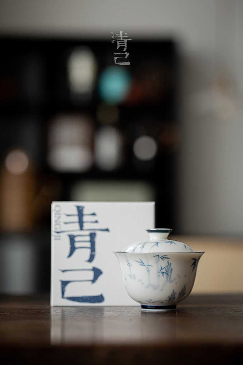 永利汇青己玉瓷盖碗青花手绘釉下彩单个白瓷泡茶功夫茶具斑竹枝福灵茶碗