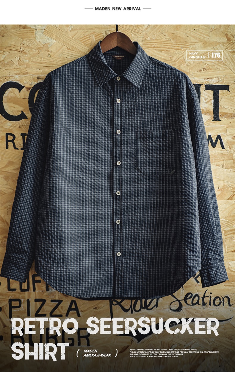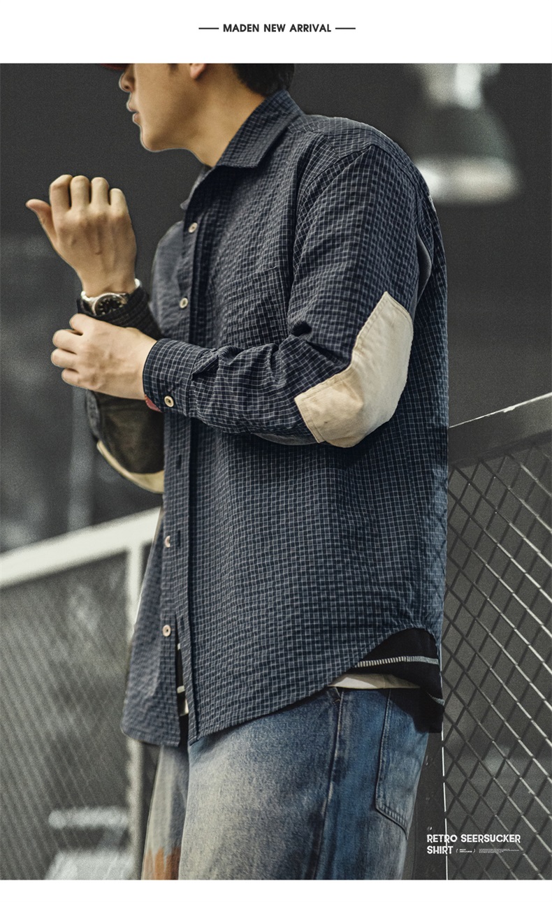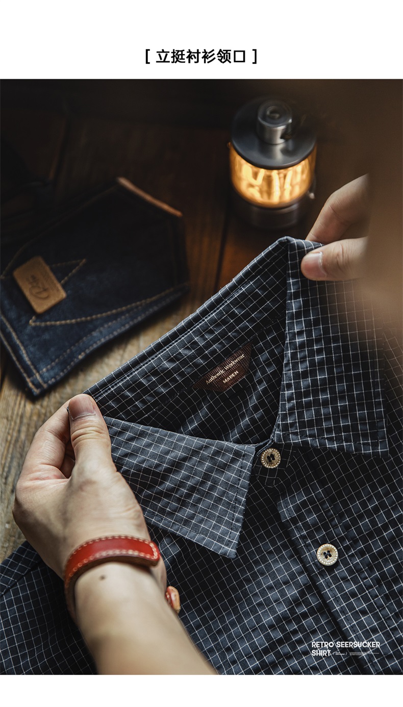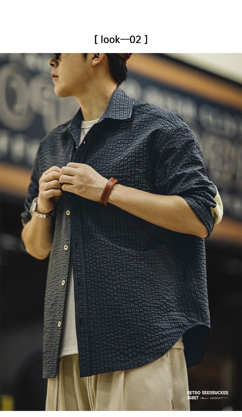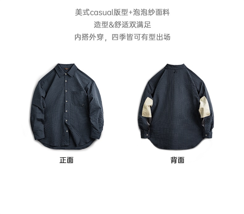 工装优选美式复古泡泡纱格子长袖衬衫肌理感翻领拼接衬衣外套男秋