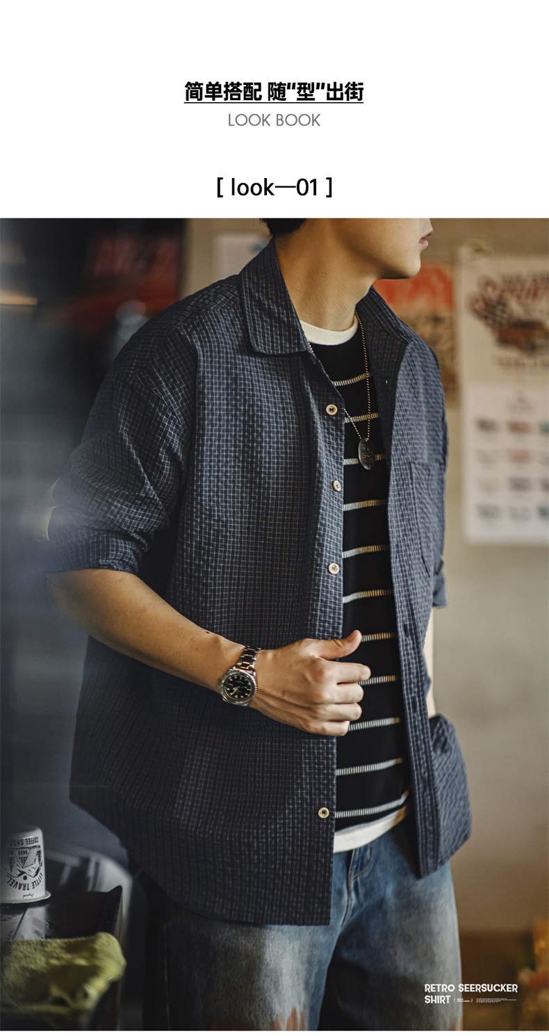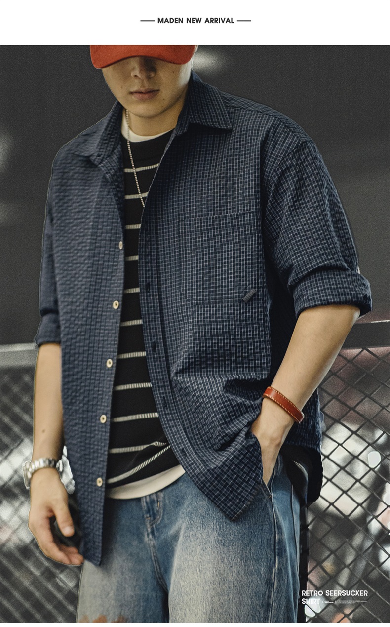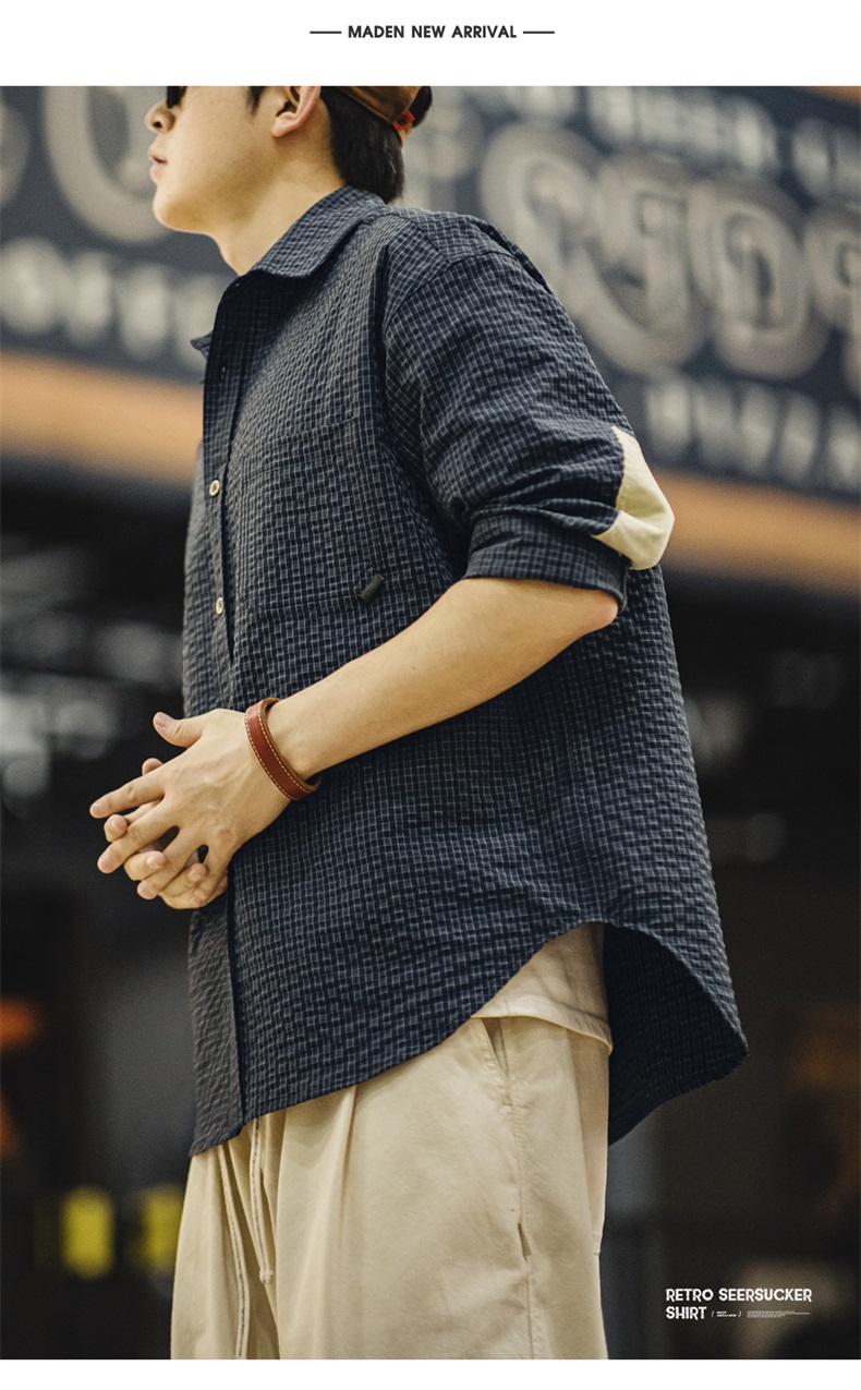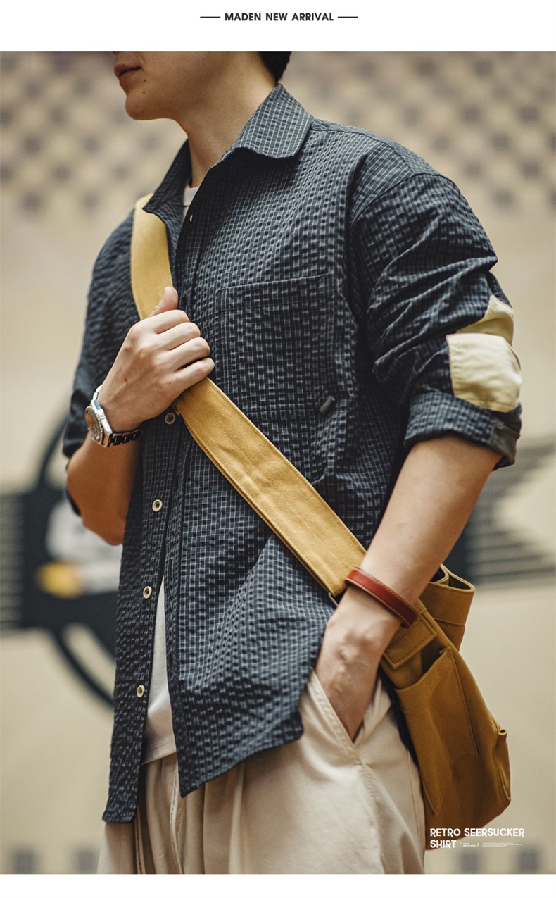 工装优选美式复古泡泡纱格子长袖衬衫肌理感翻领拼接衬衣外套男秋