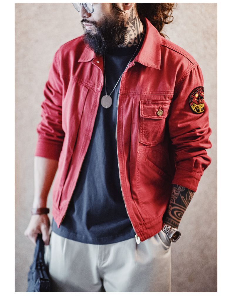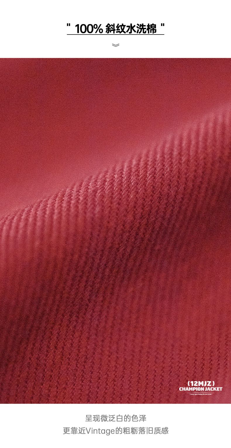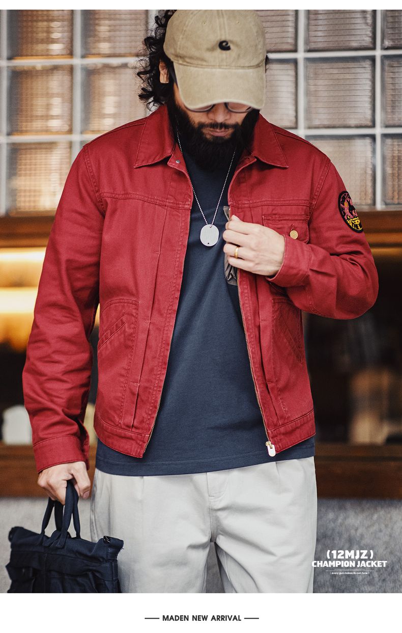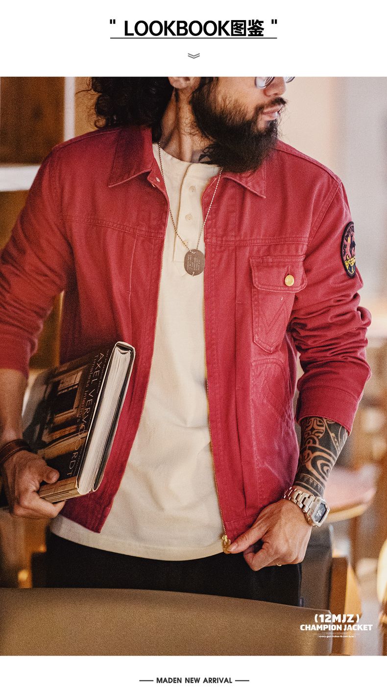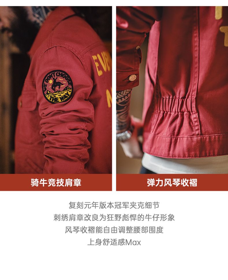 工装优选 美式复古重工刺绣冠军夹克vintage红色修身帆布外套男春