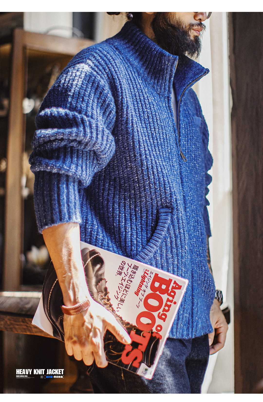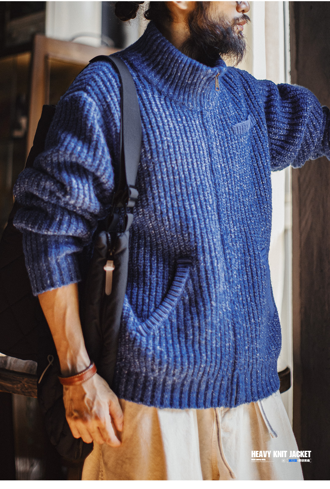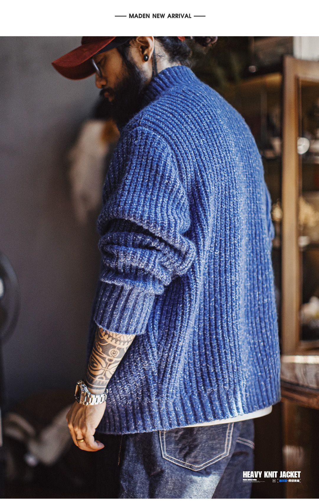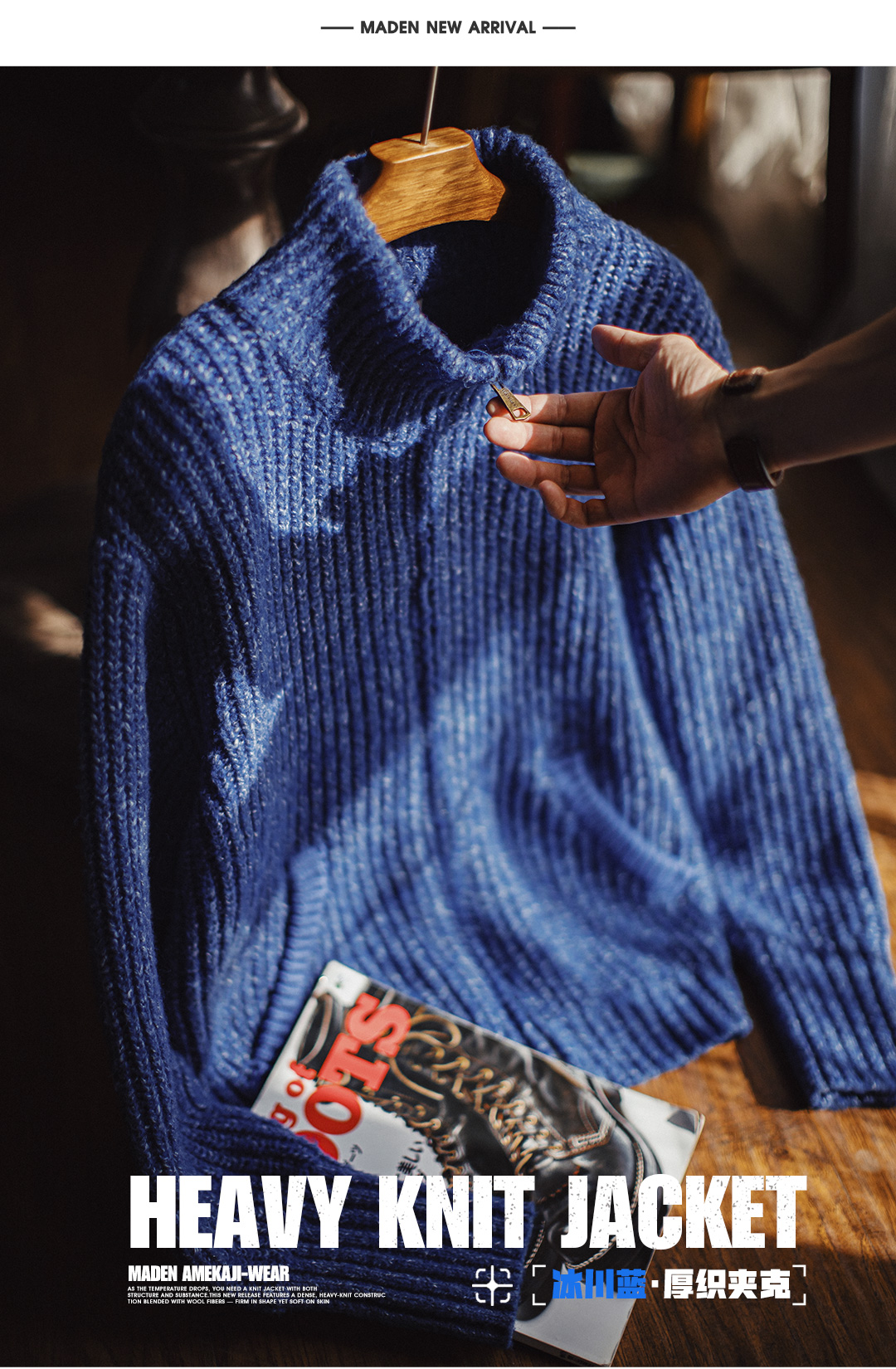 马登工装美式冰蓝色开衫加厚毛衣立领垂感高领保暖针织衫外套男冬