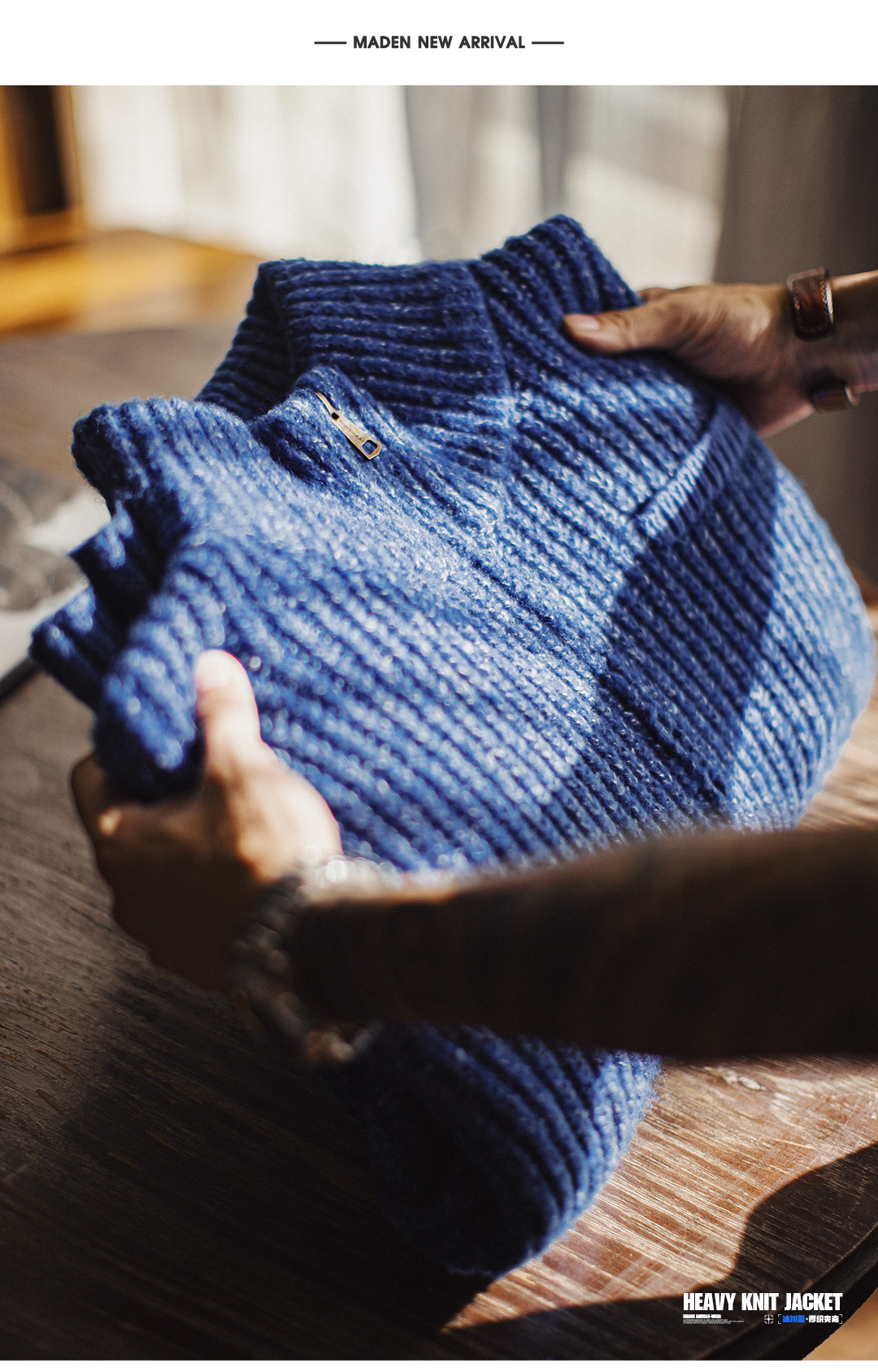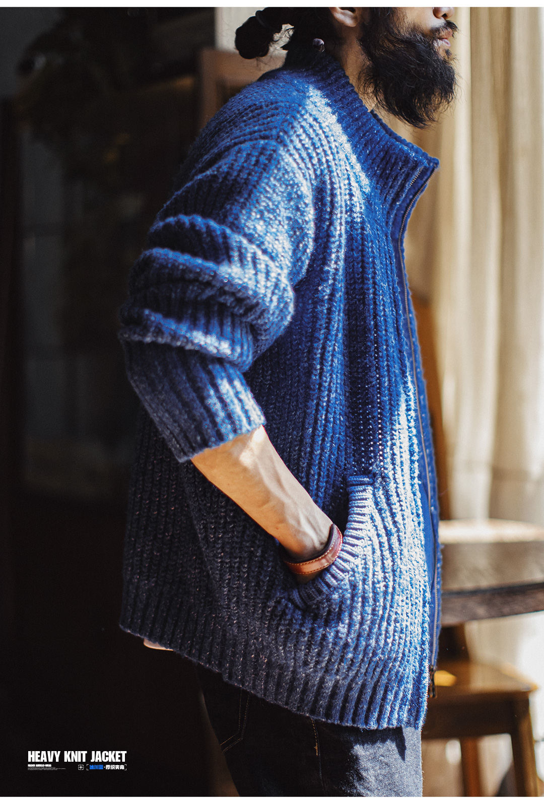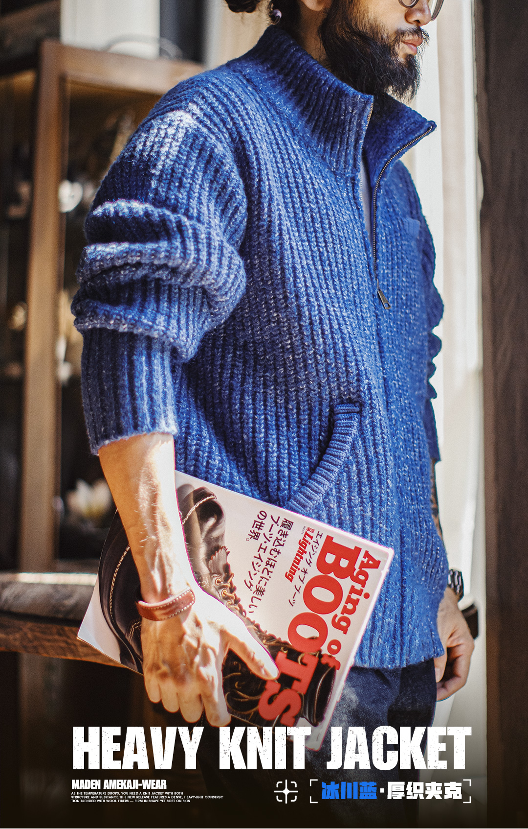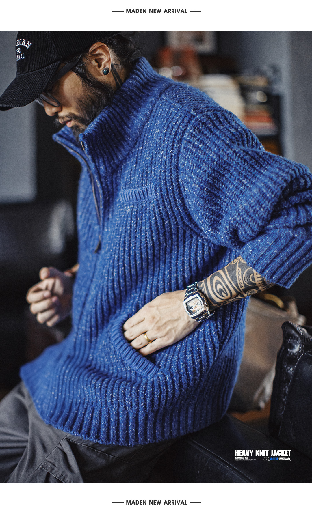 马登工装美式冰蓝色开衫加厚毛衣立领垂感高领保暖针织衫外套男冬