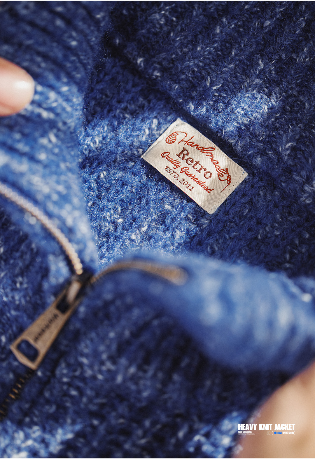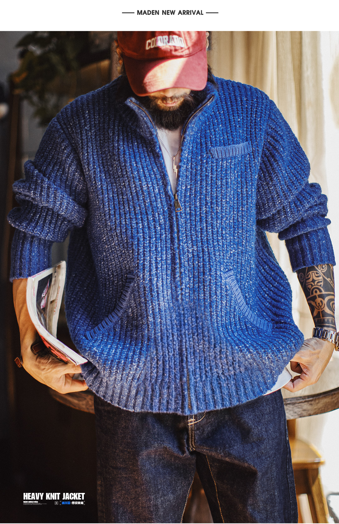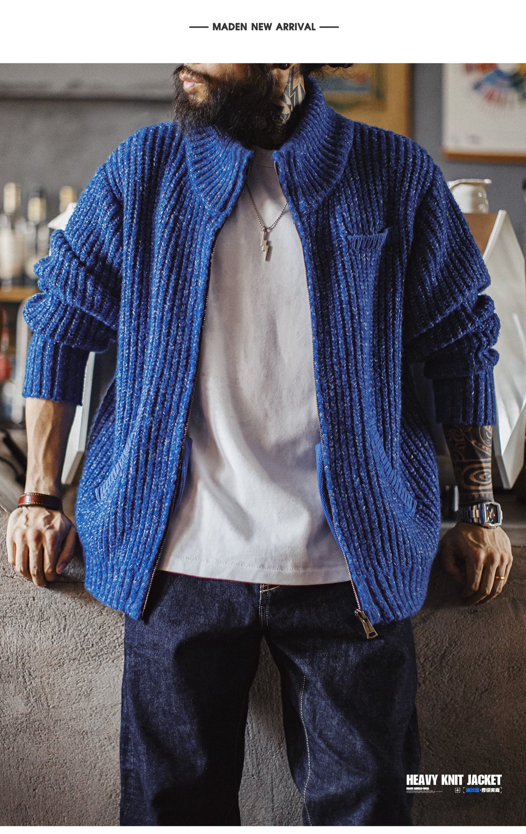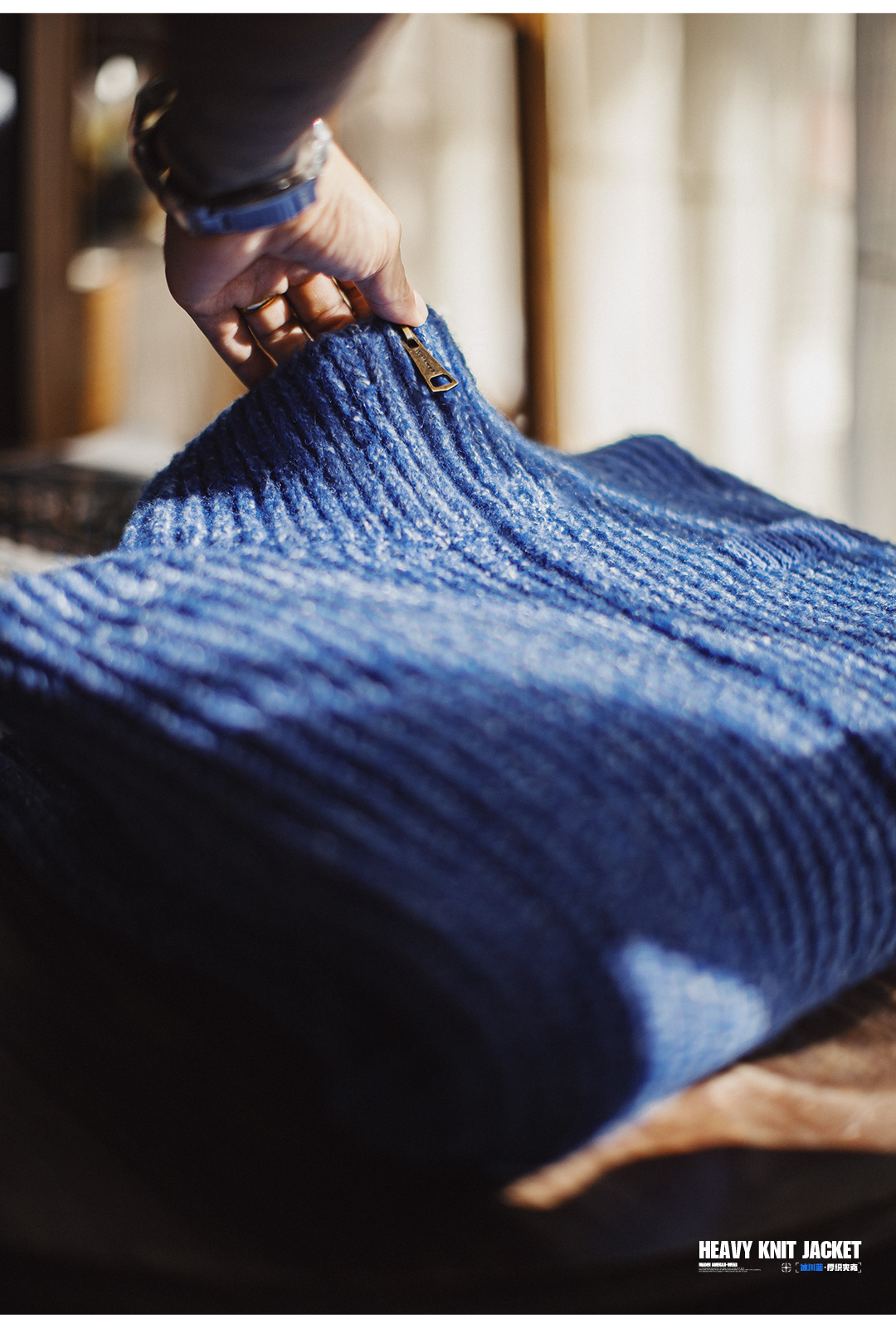马登工装美式冰蓝色开衫加厚毛衣立领垂感高领保暖针织衫外套男冬