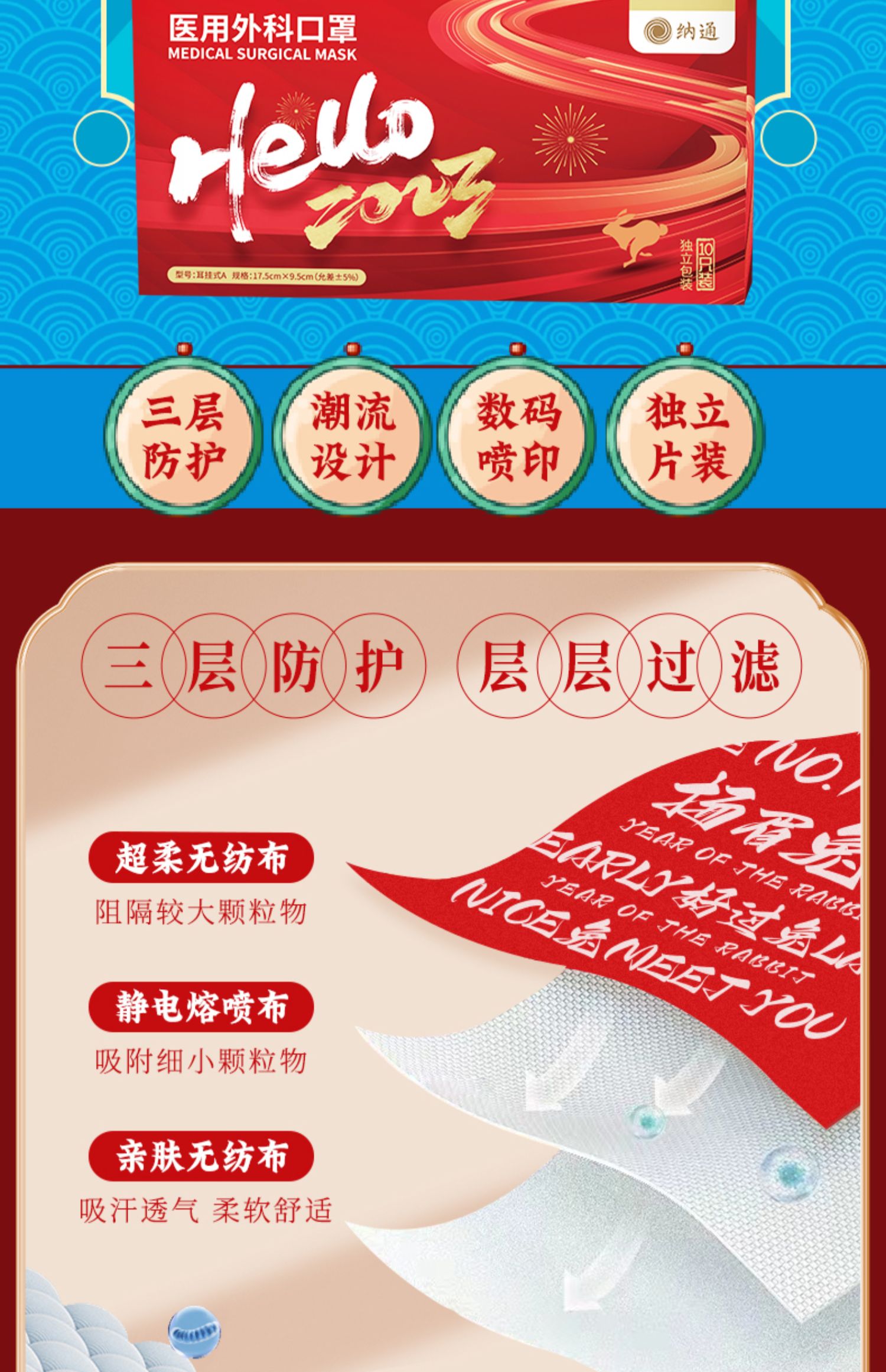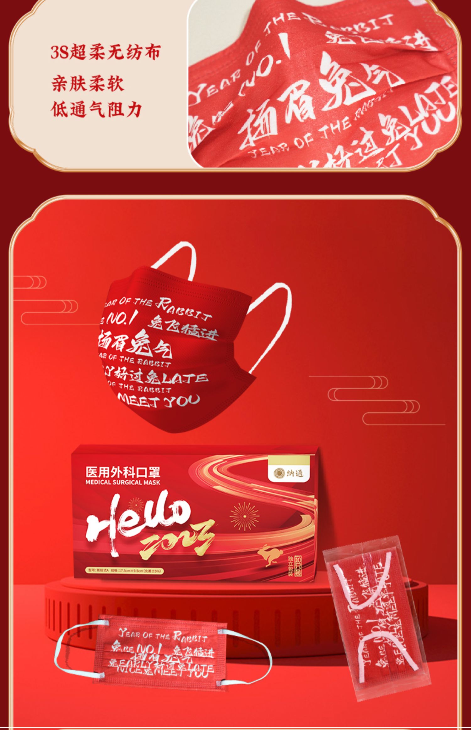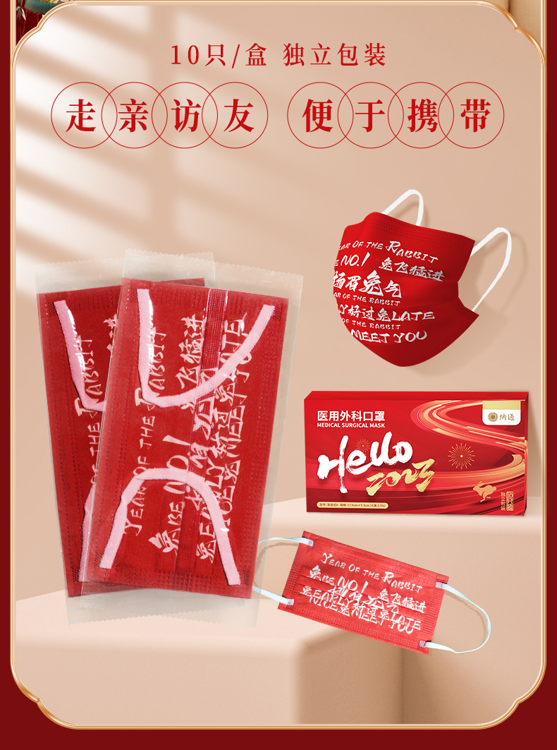 纳通印花红色喜庆医用外科口罩成人款独立装便携宽耳带