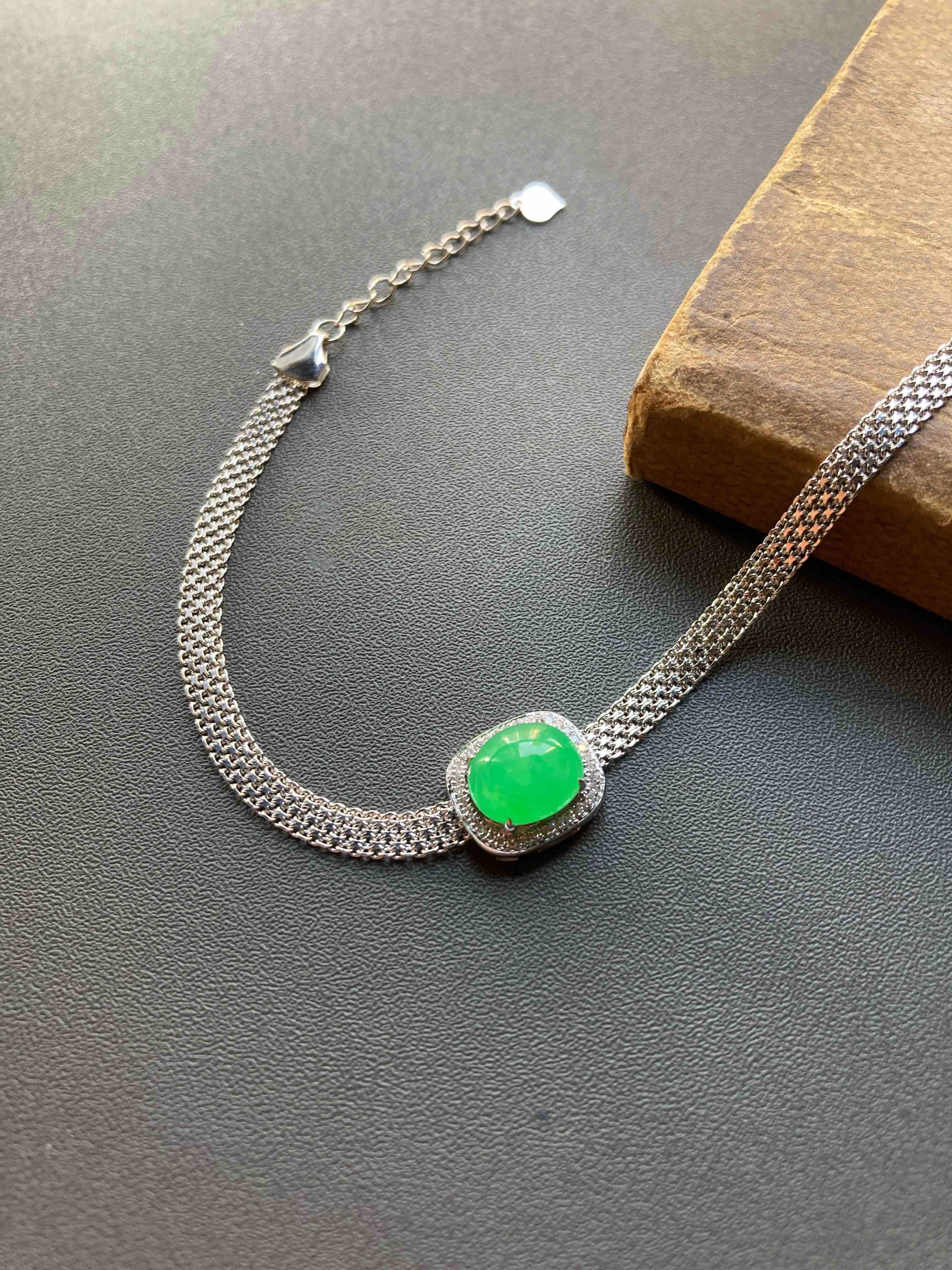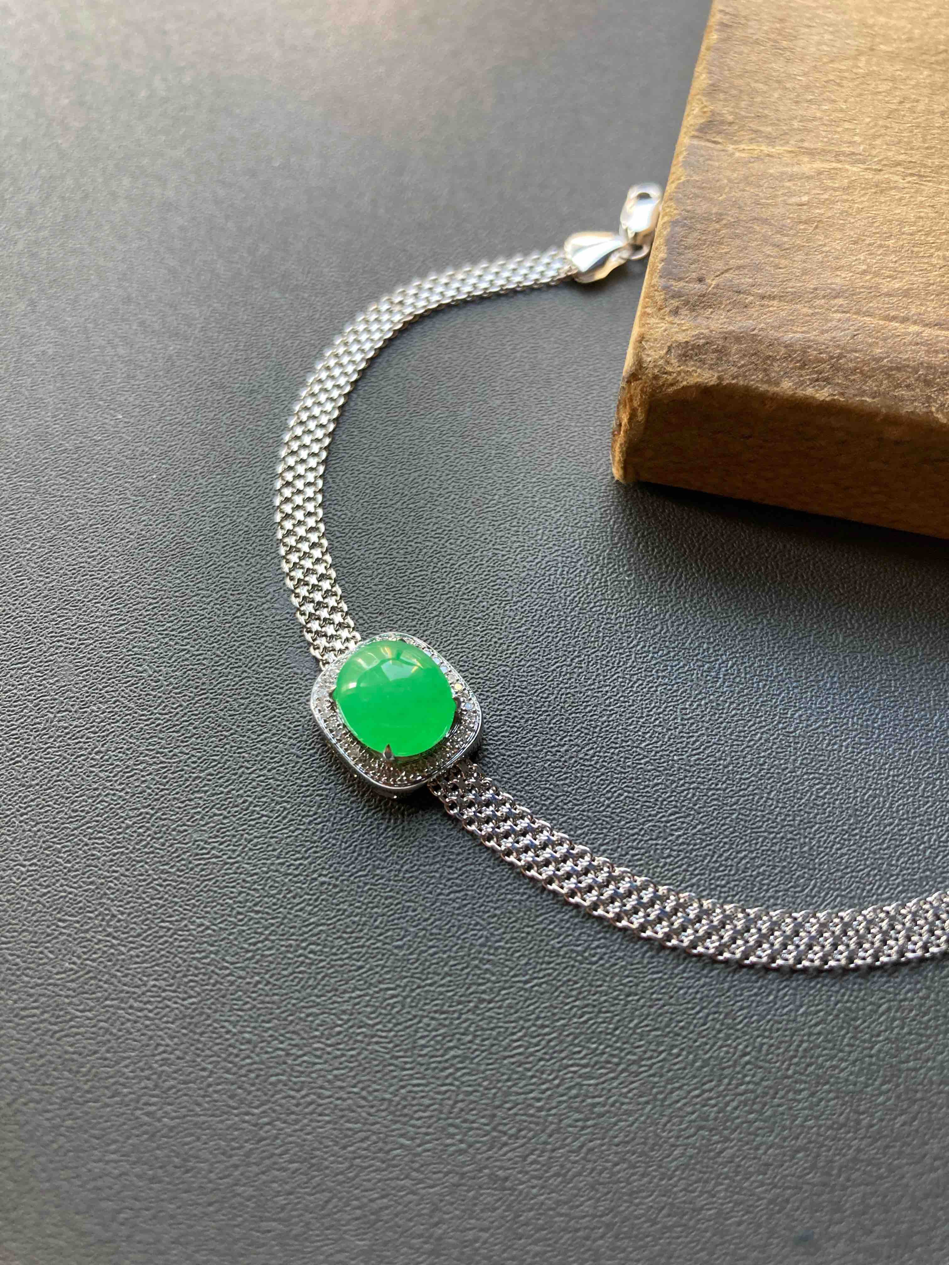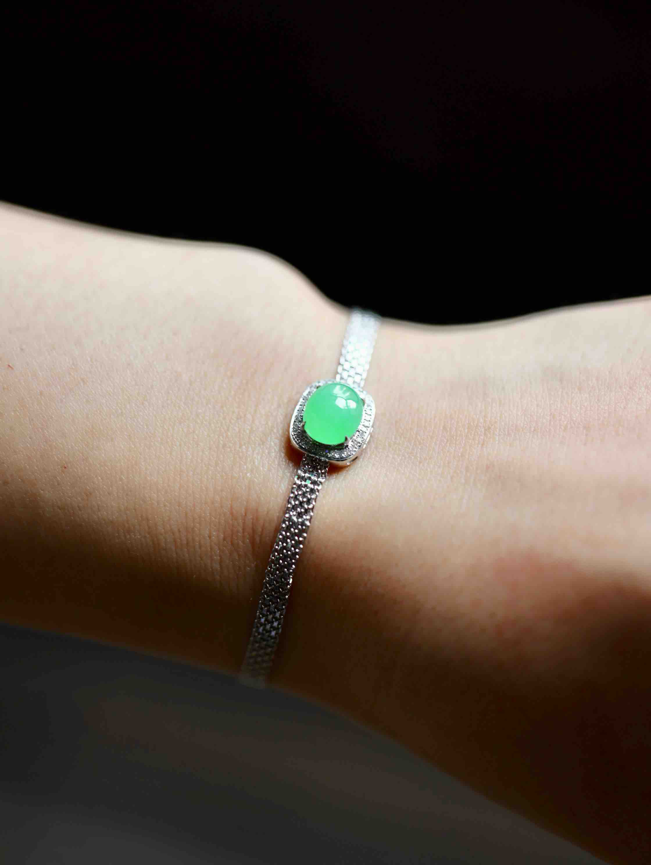 冰种阳绿翡翠蛋面手链18k白金钻石镶嵌