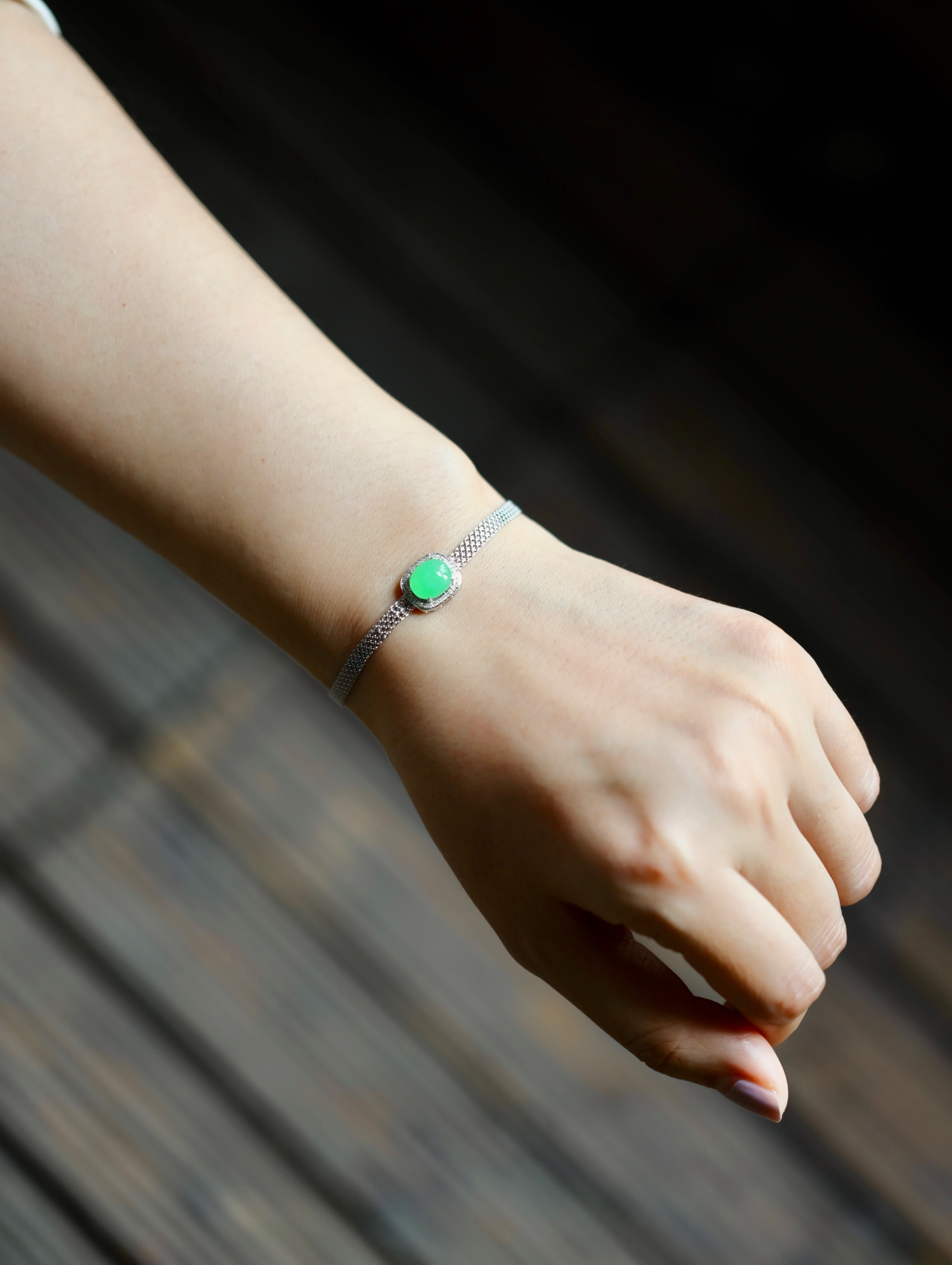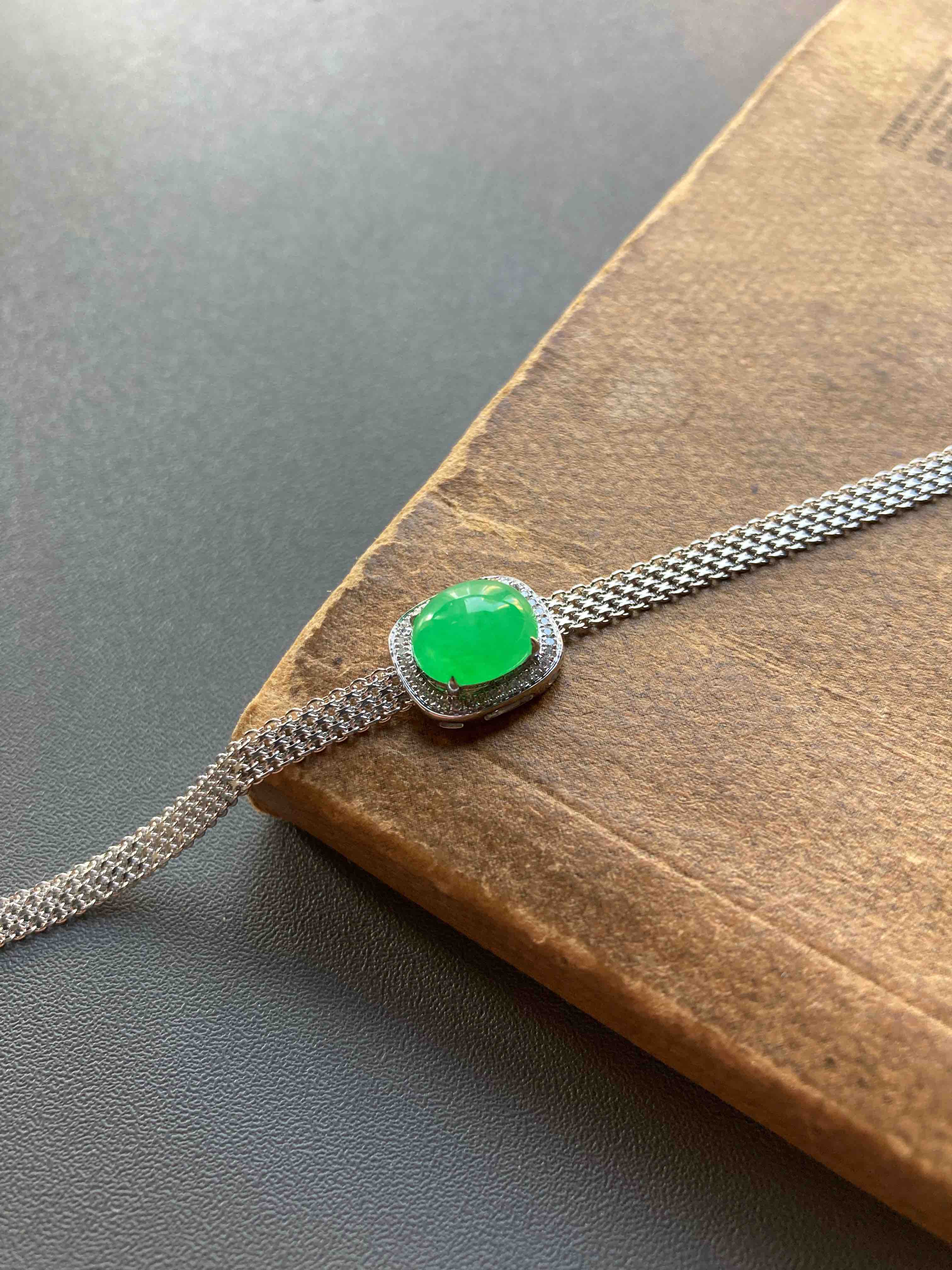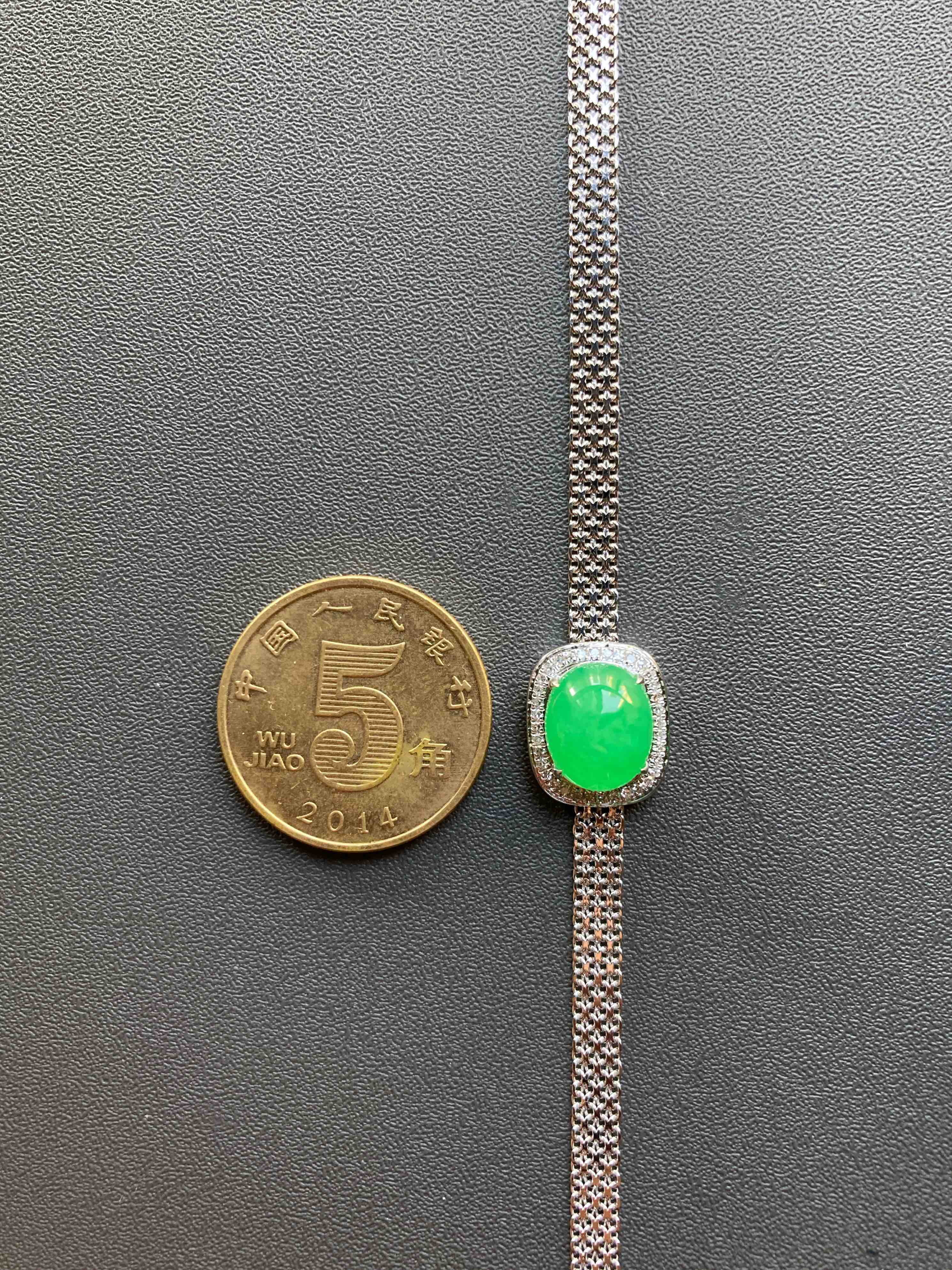 冰种阳绿翡翠蛋面手链18k白金钻石镶嵌