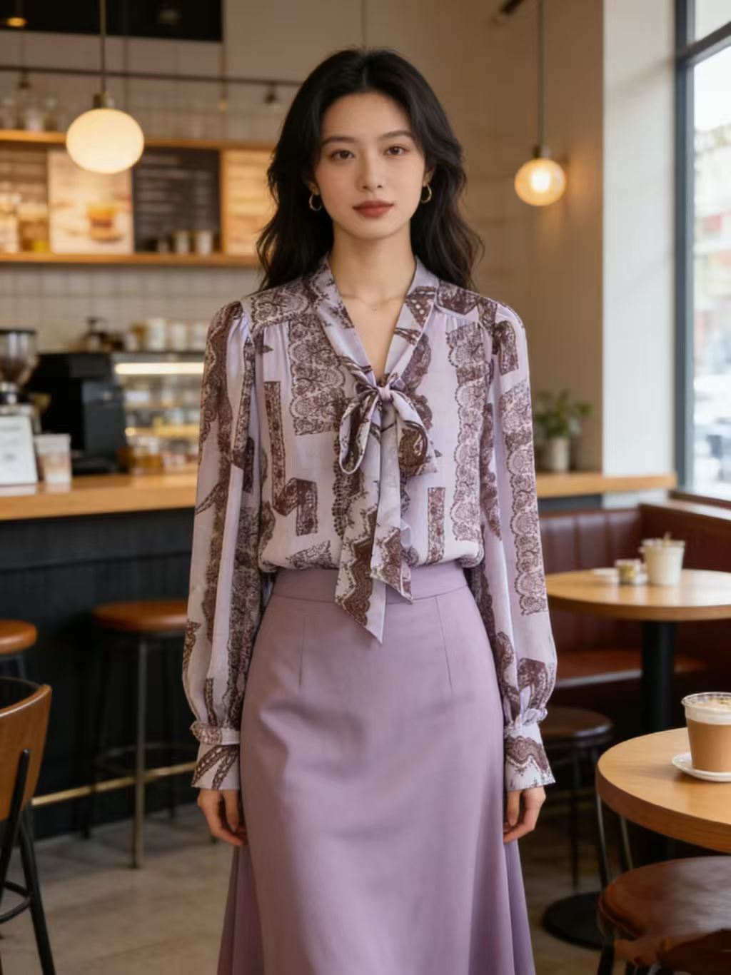 SC1F06 紫薄汗 衬衫 定制高支雪纺面料,加入暗纹肌理,轻薄透气且自带垂坠感,不易透肉气质,法式飘带领结、复古图腾印花,飘带可自由系成蝴蝶结 / 平结,领口微泡泡袖,袖口做同印花荷叶边收口。
