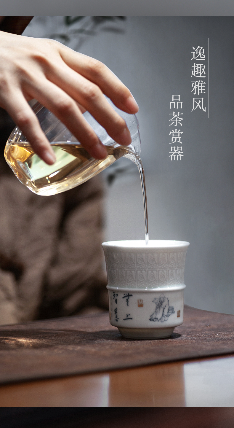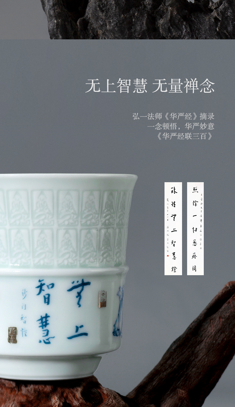 在杯身案里,融入了釉下青花工艺,发色清朗,那一抹幽蓝神韵,在白瓷的底色里,自然流淌而出,尽显文人雅致之风。