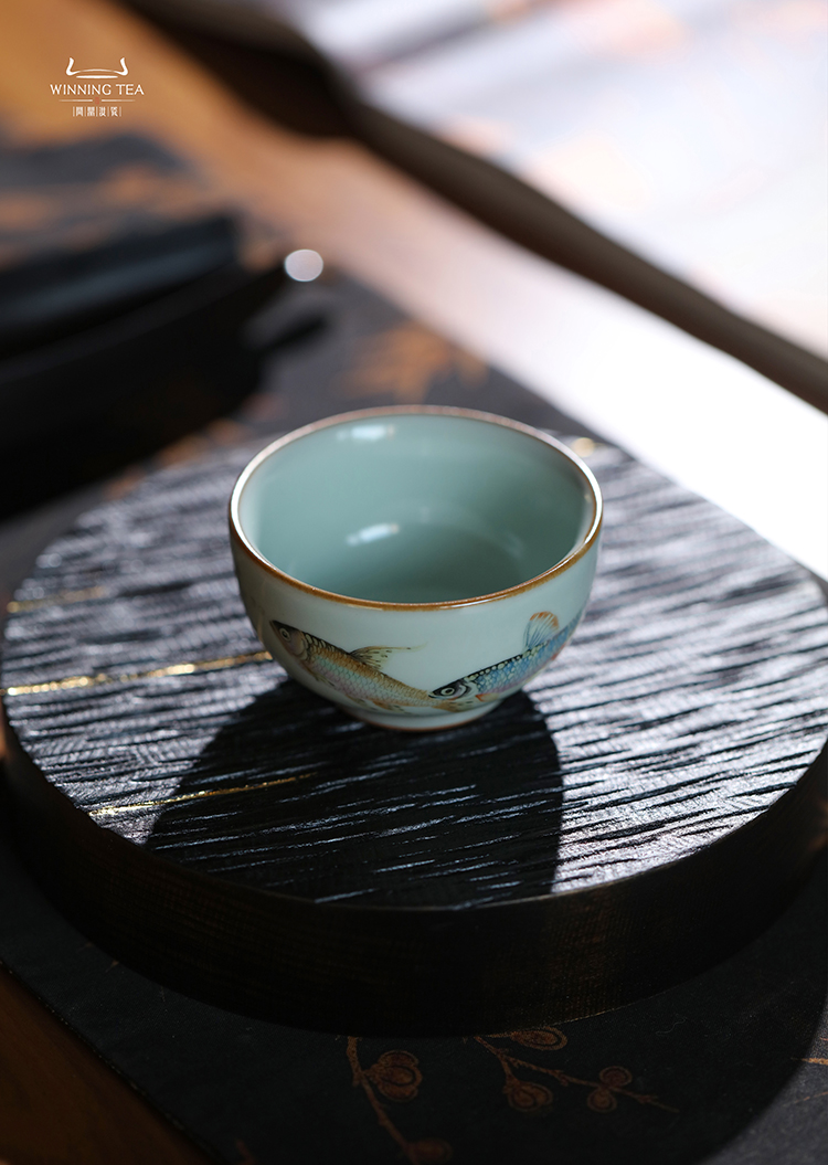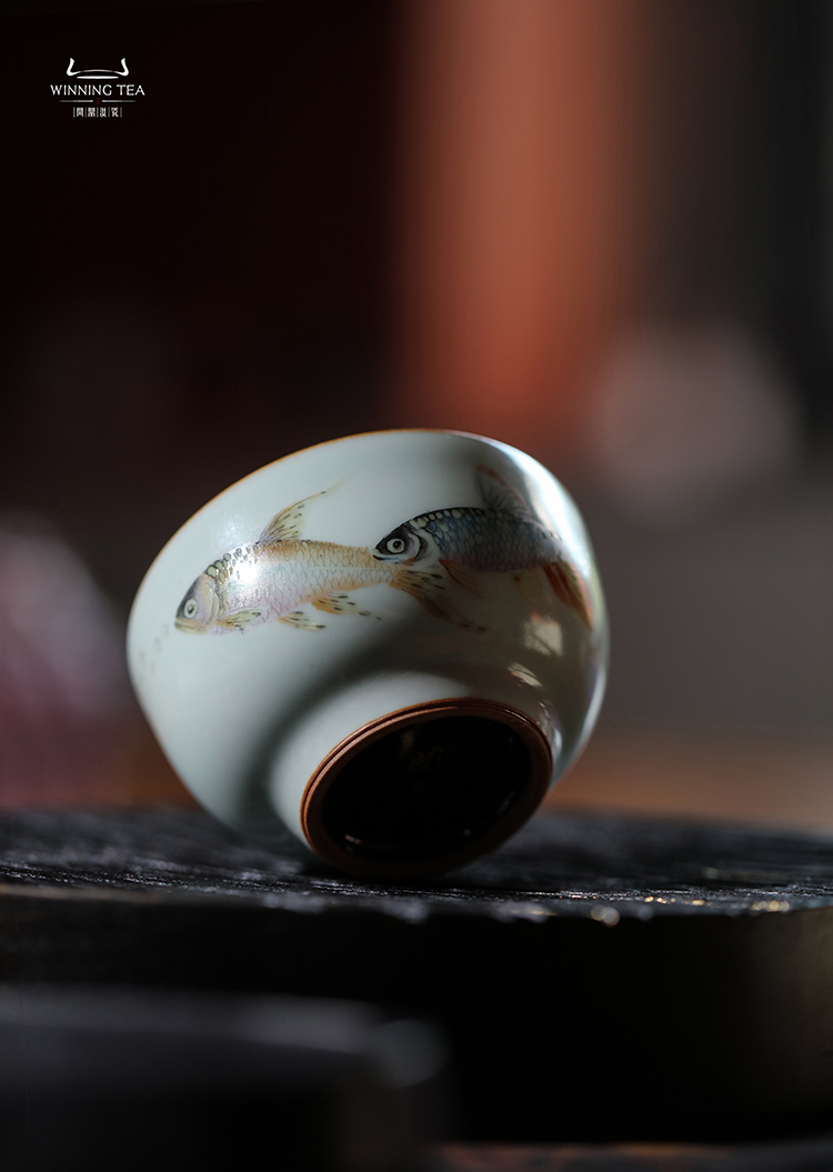 问鼎汝瓷鼎峰系列紫金釉老款听泉杯(潭影双鱼)